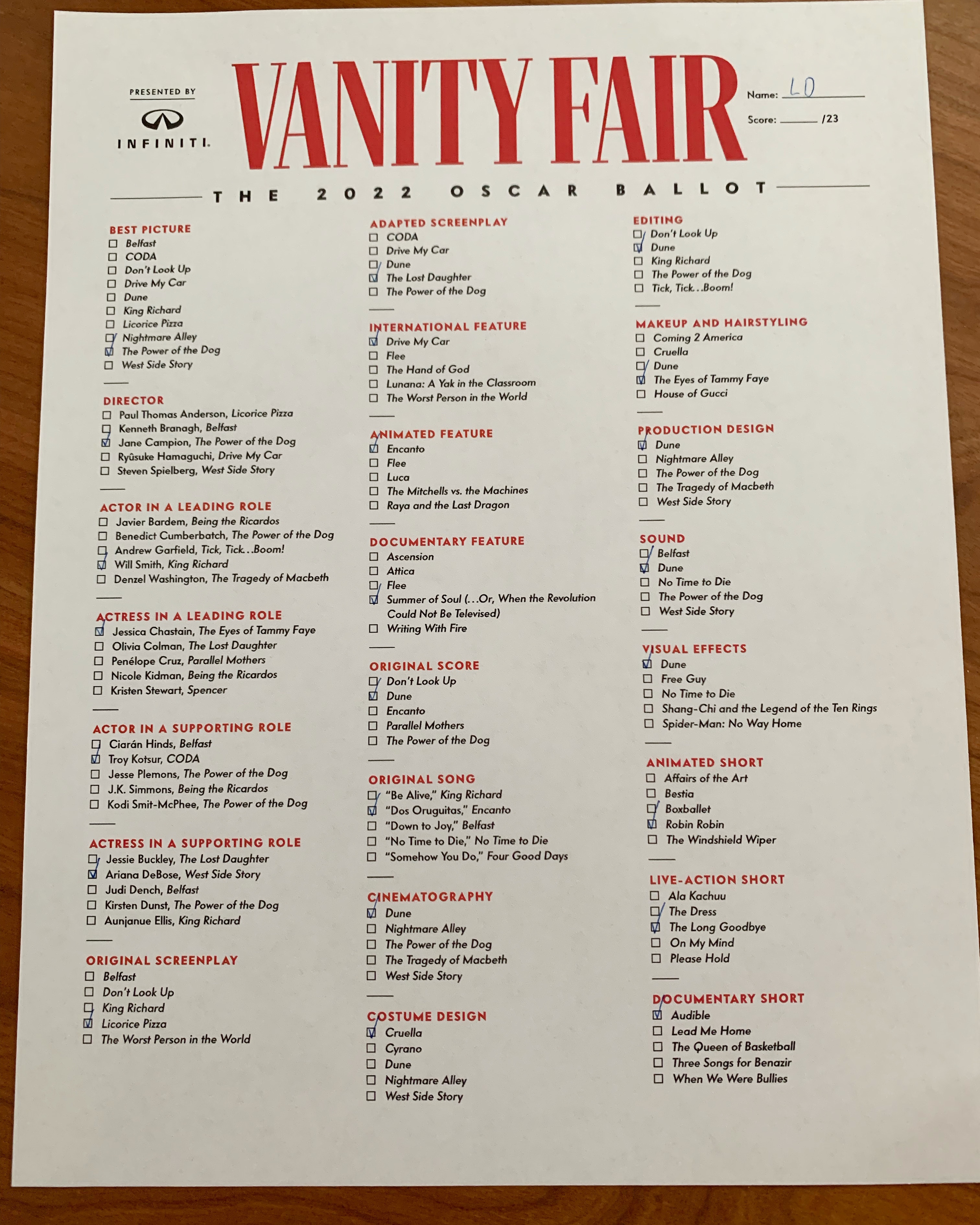 Oscar Night! It started out so fun and hopeful. We all filled out our ballots and how rude is it that I spend so much time thinking and reading and listening to podcasts about these films for an entire year and all it gets me is three more right answers than Joey?? We made Parasite ramen in 2019 and now it’s a tradition! I wasn’t sure Demps would be into it, but HE WAS. Also, we never ever eat dinner in front of the TV, but since the telecast started at 6, we had to and Dempsey was into that as well. He saw me using chopsticks and wanted one too πππ I wish I could separate that Will Smith episode from the rest of the show to be able to tell you if it was good or not, but that feels impossible. I’m already exhausted from what I’m sure will be a ridiculous take cycle, but I will leave you with this. That joke Chris Rock made was terrible and inappropriate and you should absolutely not hit someone ever. It can be both.