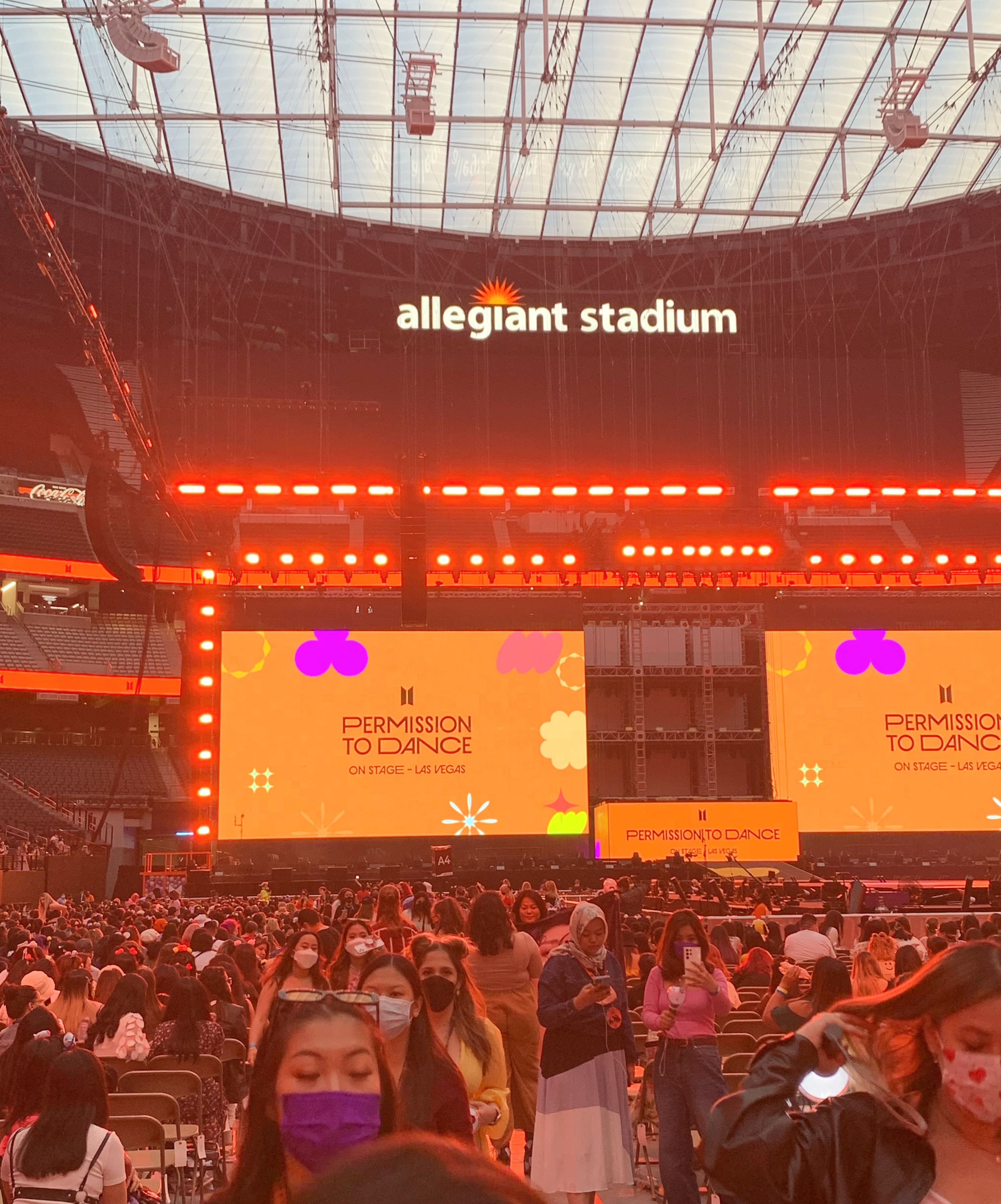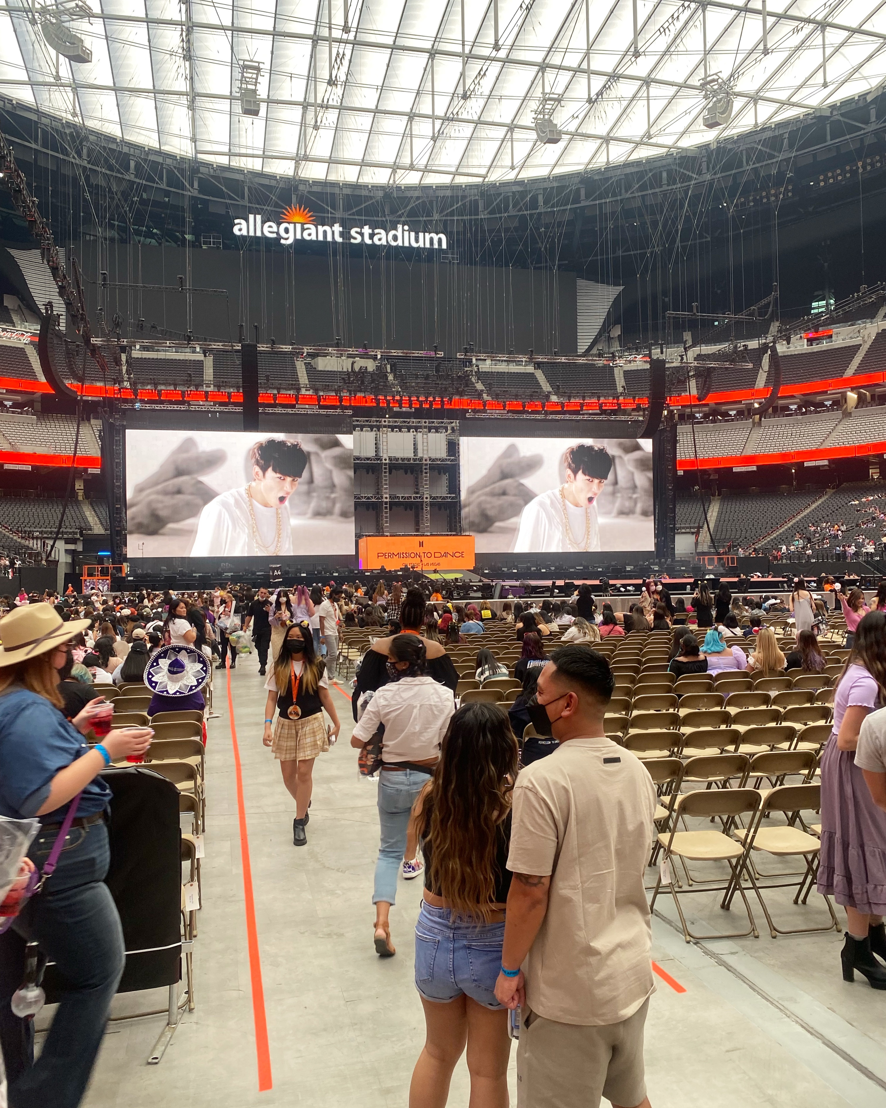 We didn’t really have anything planned for the rest of the day, so we walked down Fremont, hopped a cab to The Strip, walked through the Bellagio — I can never believe those fresh flower displays they always have! Smelled so good! — chilled at a table outside and watched a hummingbird zoom about, visited the PTD sign at Mandalay Bay, let Joey get his 10 minute gambling fix and then eventually made our way over to Allegiant Stadium. We were going to check out the merch tent, but turns out that’s a whole thing and you have to get there EARLY. Fortunately, you could buy your BTS Official Light Stick (aka Army Bomb) at an express booth. Picture to come if you’ve never seen one, but it’s programmed to your seat number and it’ll automatically light up at the concert and make sort of a little light show out of the crowd. I was more excited than I expected to be to finally have one!