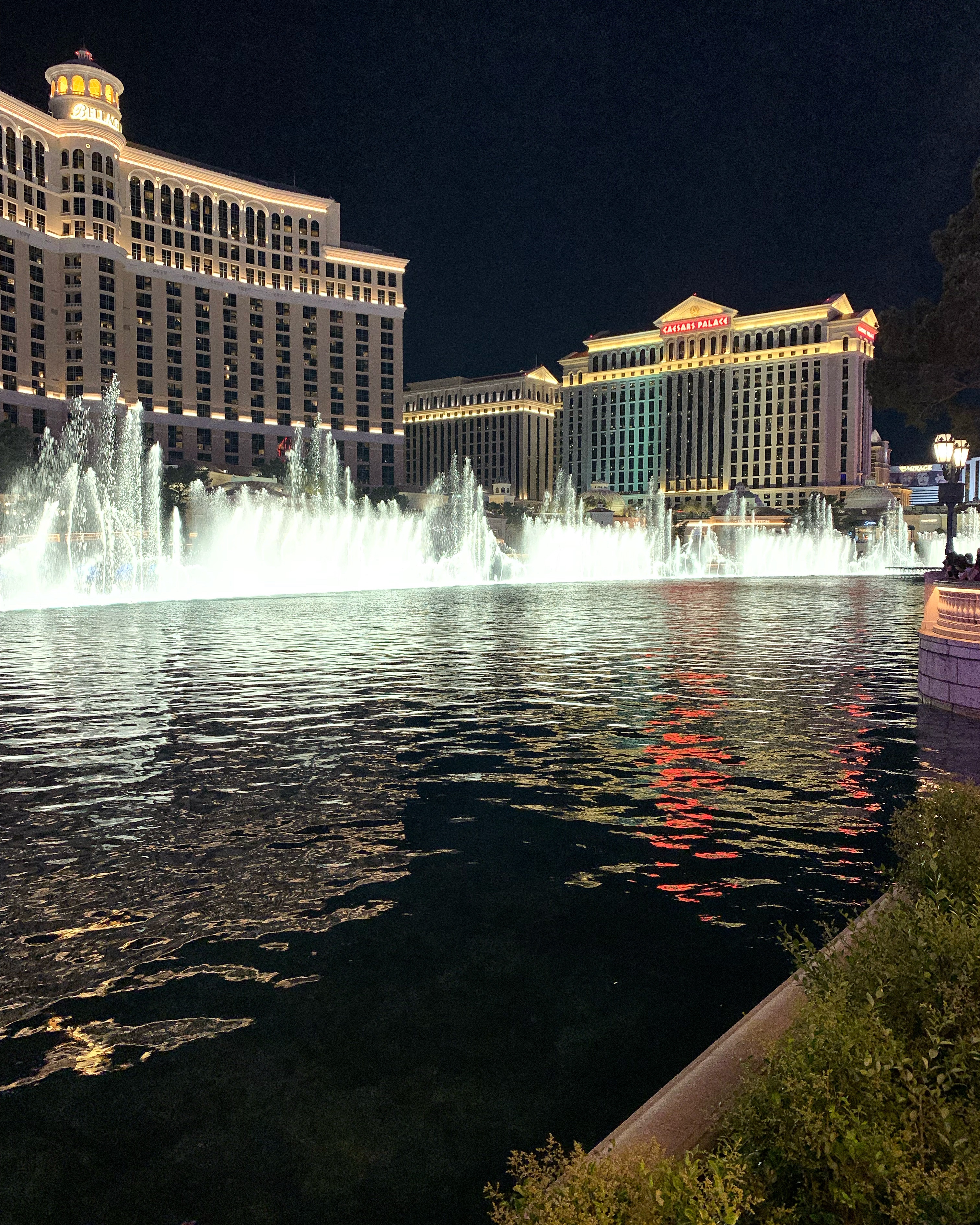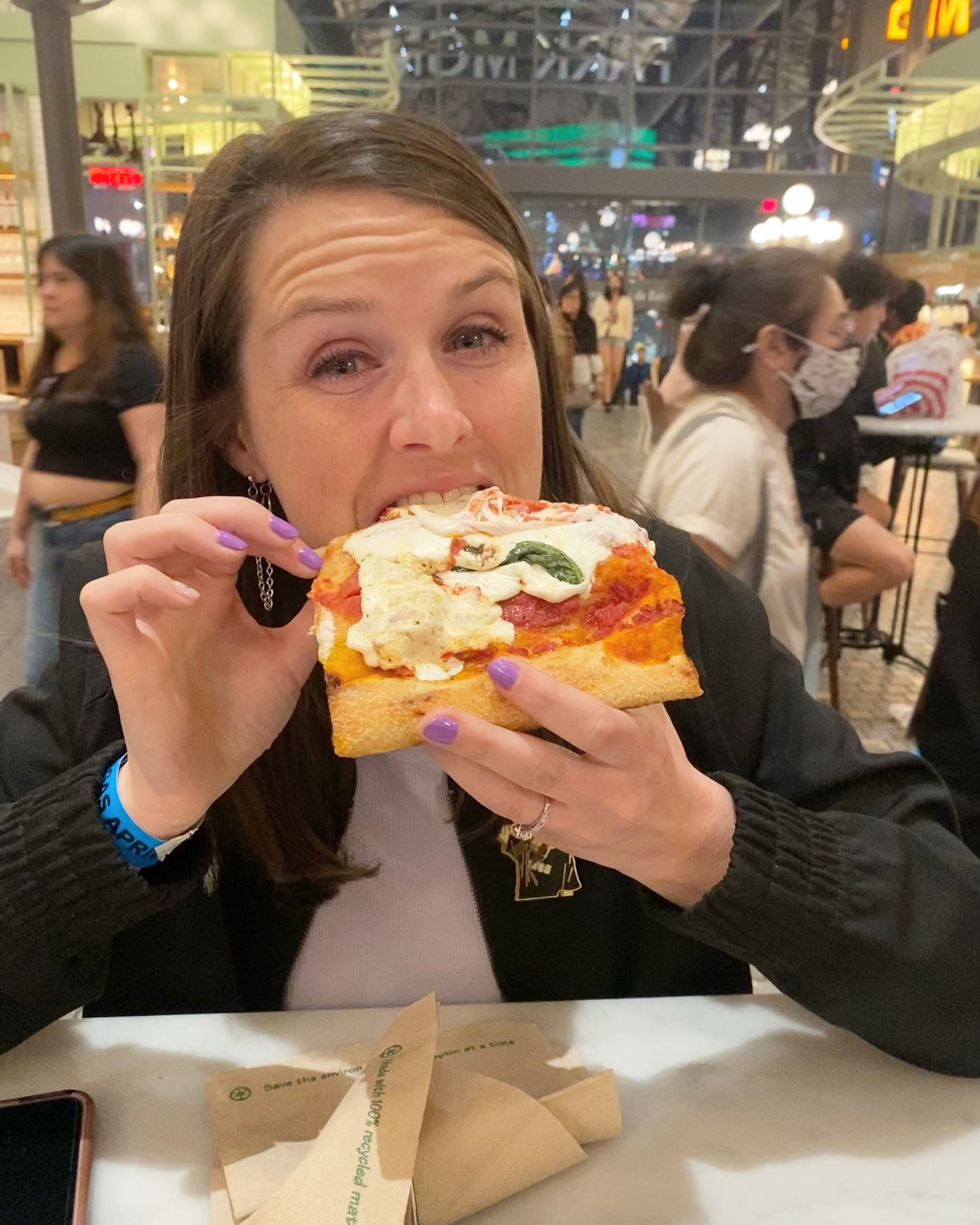 They shot off so much confetti at the end of the concert and everyone was crouching on the ground to pick it up. I love us! I grabbed a few pieces as they fell to bring home for Dempsey and he put them all in his mouth 😬😂 They took a few breaks for costume changes and those were the only times anyone sat down, so Joey’s back was a mess afterward 😂 We thought the ride share line was going to be a mess, so we walked back over the highway to The Strip, made a pizza pit stop at Eataly, then over to Bellagio to try and catch the water show hopefully playing “Dynamite” or “Butter” but it was just playing Cher. What can you do! Once everyone was decked out in their BTS gear, it was much easier to spot all the ARMYs and WHOA, THERE WERE A LOT OF US!
