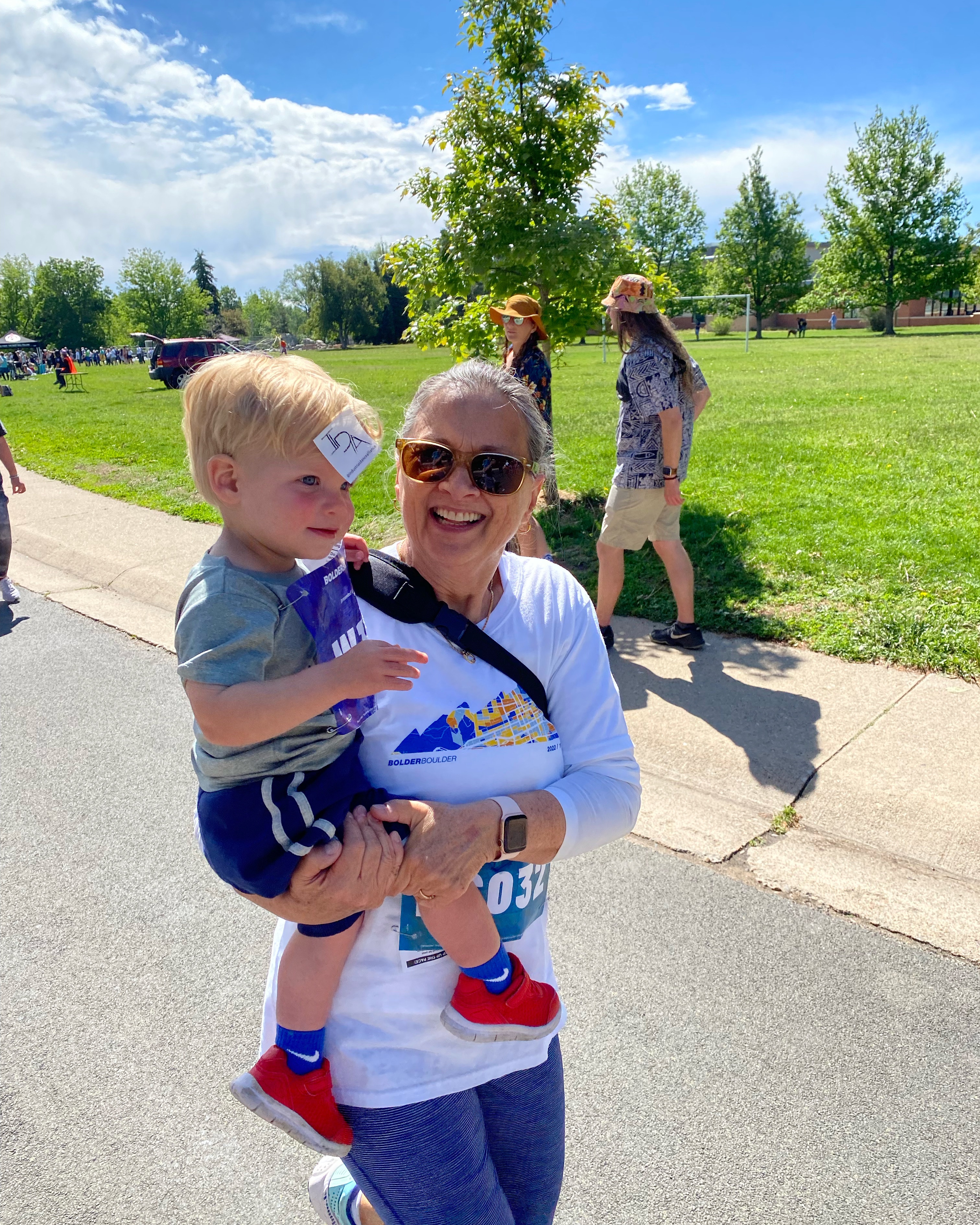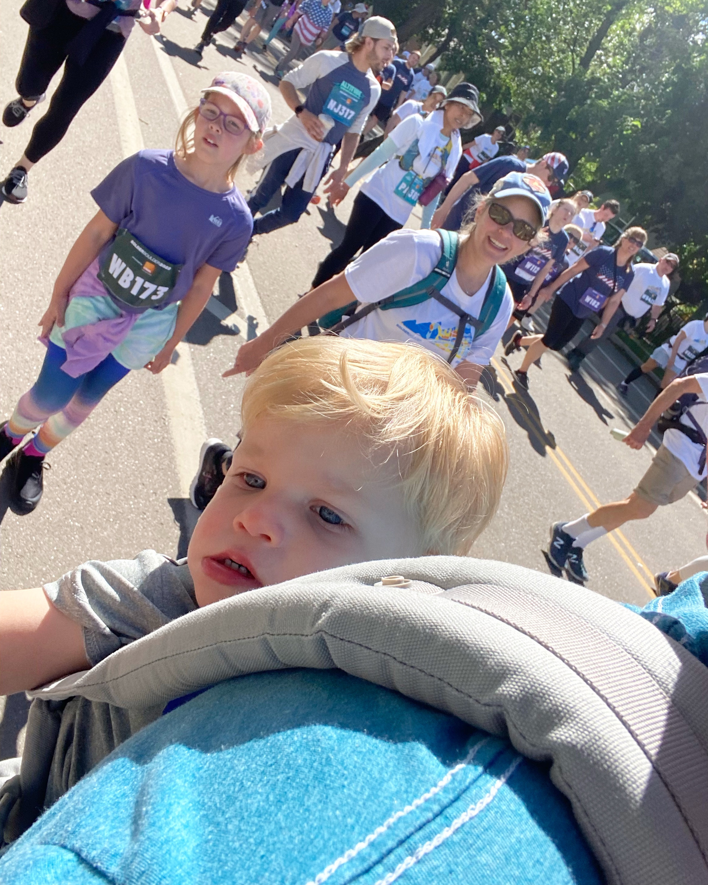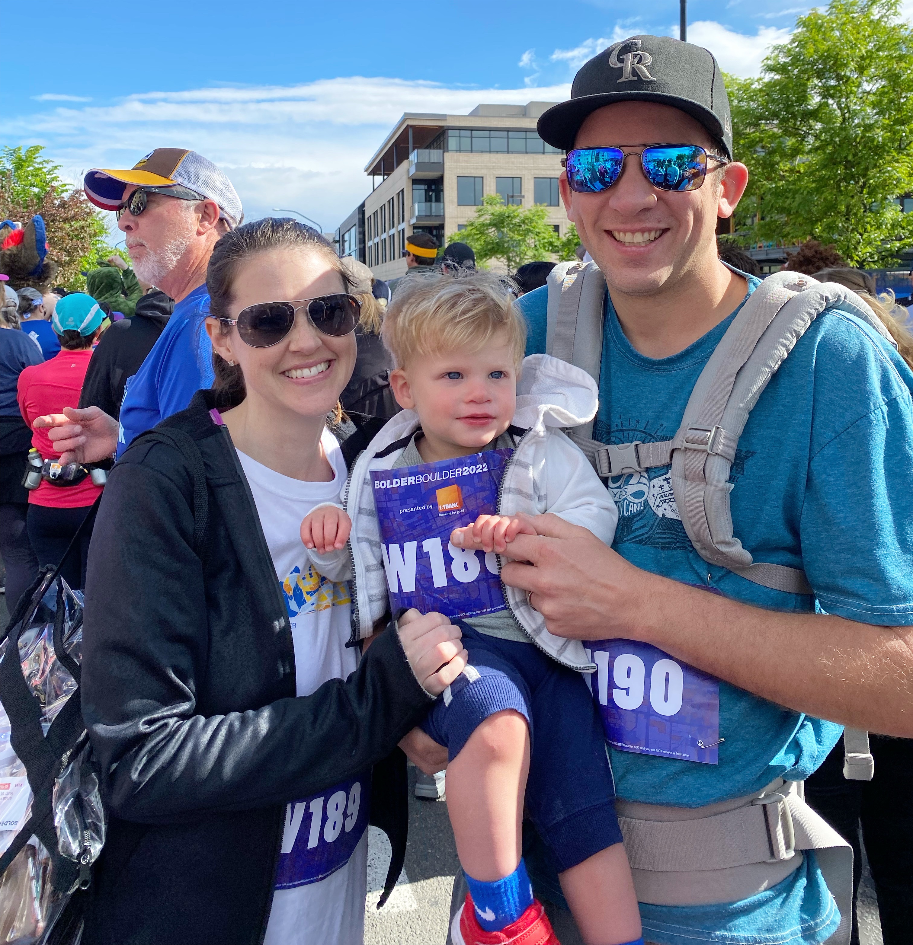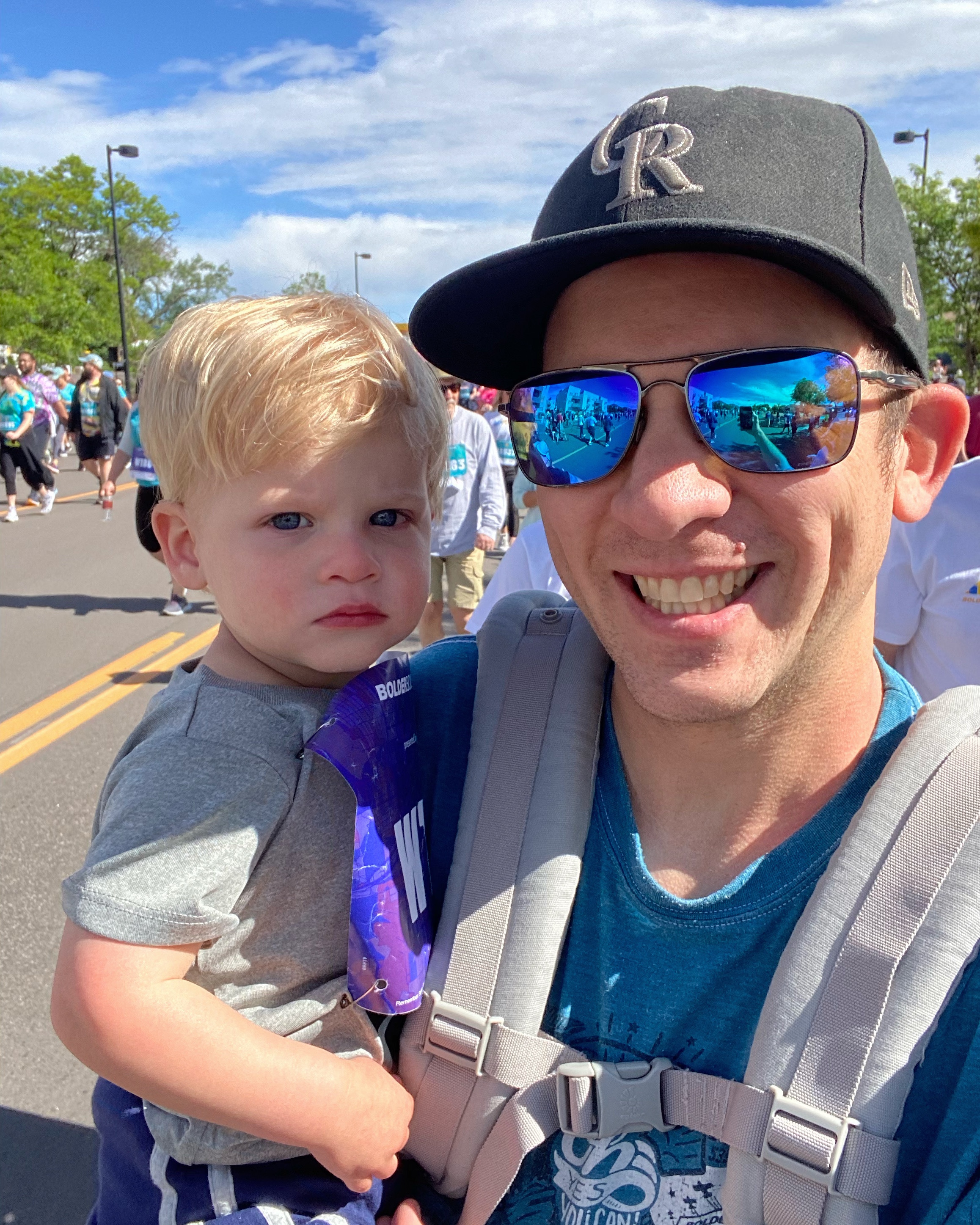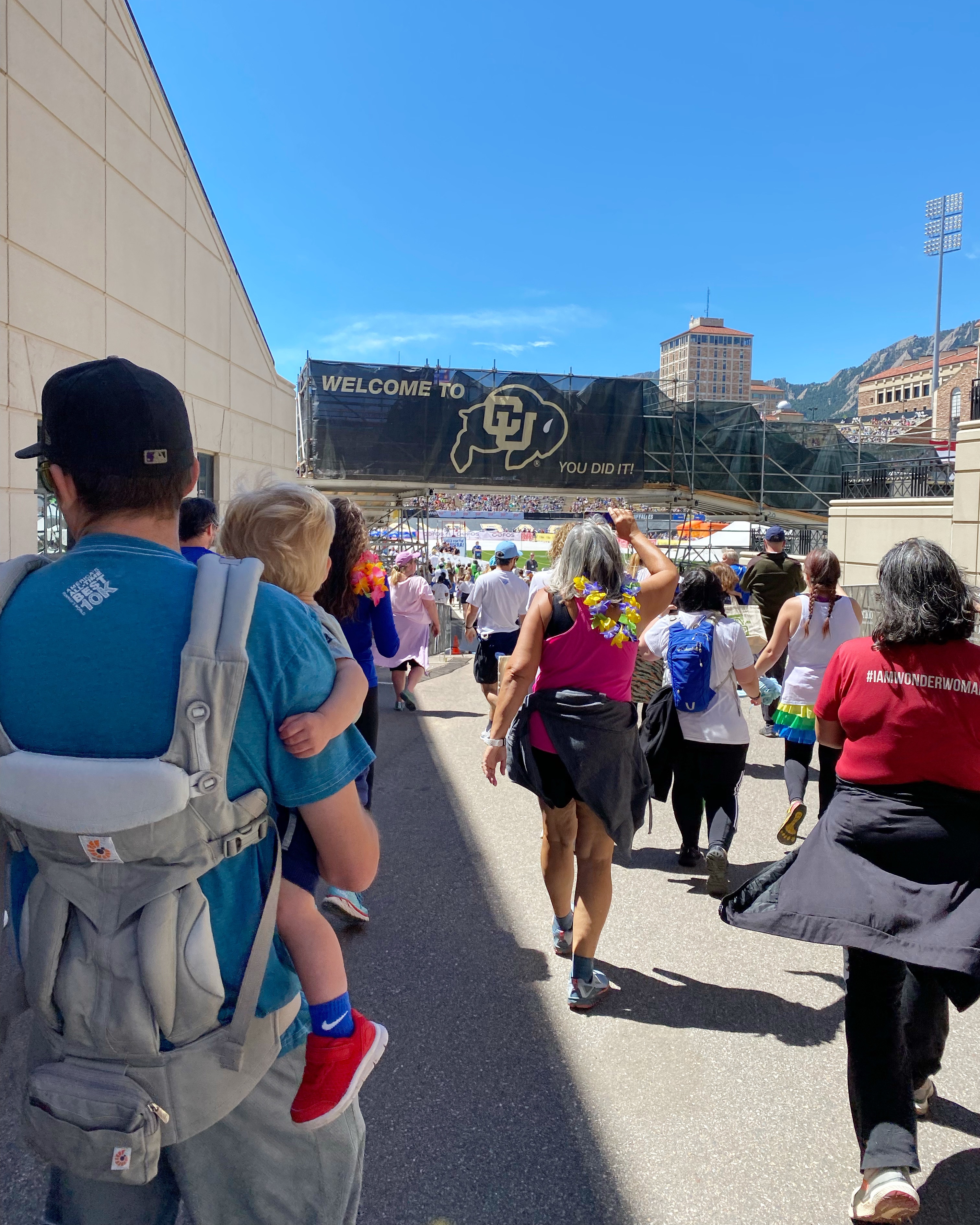 Memorial Day and the Bolder Boulder β€ The race was back at the regular course and it was so so nice to be back. Joey and I couldn’t remember the last time we’d been to Boulder but it may have been for the BB in 2019! We picked up my sis and Wayne and drove close to the start line, where Joey dropped the four of us off and then went to park. We had time, so we hit a coffee shop near the start and Demps did not want to be contained π Finally my parents and Joey (Lori was sick π₯) made it to the start, so we all made our way to the W wave. We’ve never walked the race before so it was a totally different experience! Everything is much more crowded by the time the walkers get there, so there were full on lines for stuff like the slip-n-slide or cotton candy or (shudder) keg-stands. But it also meant we got to see the men and women’s Elite runners go by in, which was so cool! Six miles is a long way for a toddler (and also for me and my poor hips and calves and feet!), so Joey carried him a lot of the time and my mom, sis, Wayne and I helped as best we could. We did put him down a few times but he’d end up dancing to the music being played on the sideline or getting distracted by a puddle in the street ππ We did eventually make it to the stadium though and it was the cutest thing when Dempsey was waving and clapping like all the people in the stands. We put him down to walk across the finish line on his own two feet and he had one hand in Joey’s and reached back to grab my hand with the other π₯Ίπ₯Ίπ₯Ί