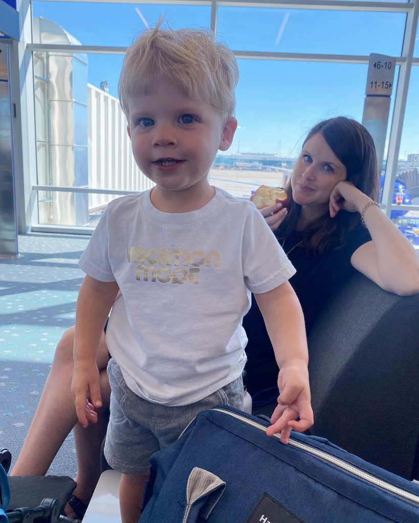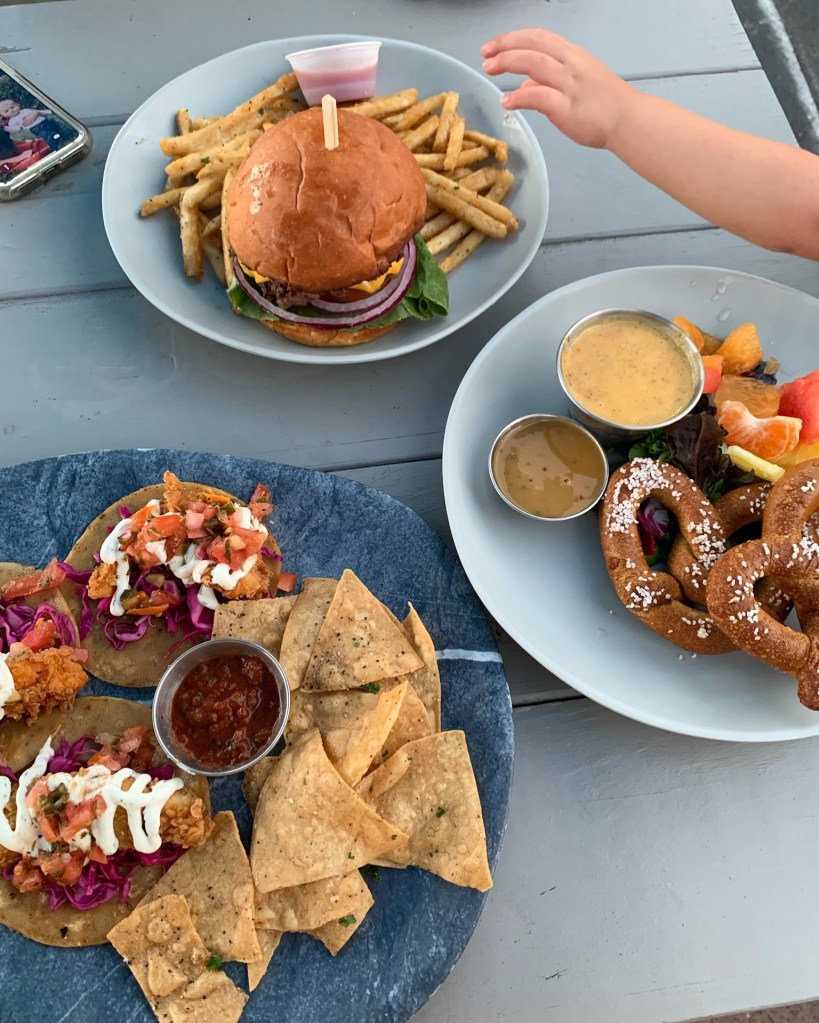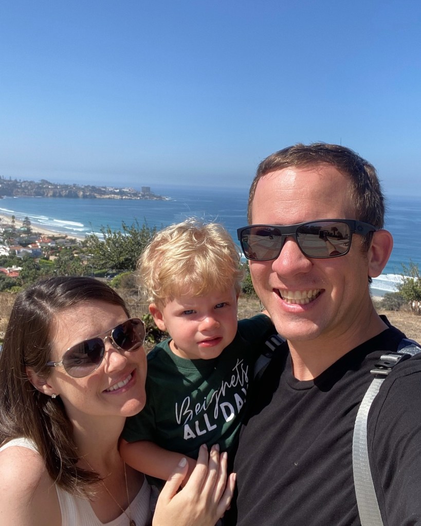 This was our first week long vacation since 2019 and our first ever vacation as just the three of us, can you believe it?? We flew out late afternoon on Saturday, so we could fit Dempsey’s nap in beforehand and he did so good on the plane, with his very own seat, no less. We had his little fanny pack all ready to go for him! He didn’t really want to stay seated or buckled but we were able to distract him every time he got antsy and wanted to get up. Picked up our rental car and headed to our Airbnb and it was about a million degrees inside there. A pregnant woman’s worst nightmare 😱 It was somehow less hot outside than in. Unpacked a bit then walked over to Solana Beach Fish House, which wasn’t glamorous by any means, but sat us right away and served pretty good fish tacos!
