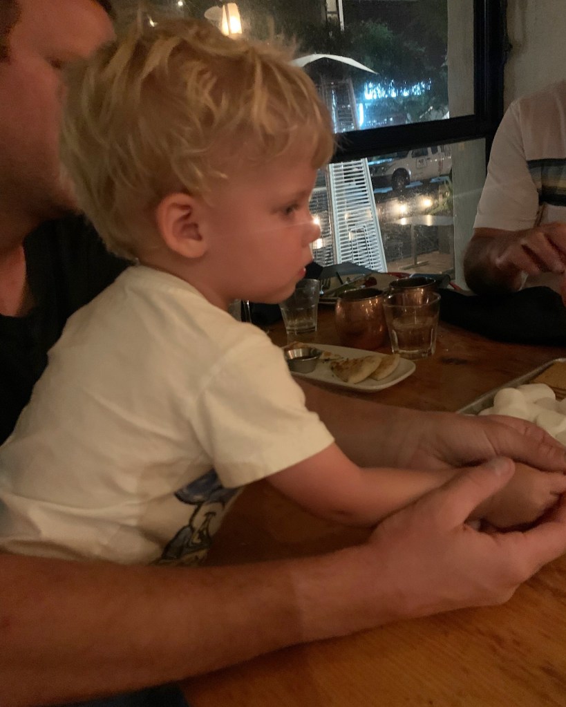 Back to our normal routine on Wednesday (and apparently I took very few pictures this day?), so after we were able to drag Dempsey away from his important game of Backgammon 😂, we hit up Achilles Coffee for drinks and breakfast, then headed over to the beach. What a difference a day makes! This was our first non-weekend/holiday day there and the beach was EMPTY. Dempsey had taken a little step backwards in terms of his water comfortability but he still had fun using his new binoculars on the beach. After his nap, we walked down to a nearby toy store, then showered and headed into San Diego to meet Steve and Lorna (who were also in California) for dinner at One Door North. I cannot believe the traffic into SD! How do people do it?? We were 15 minutes late for our reservation and we had left an hour before! Luckily, Steve and Lorna were there on time and had already ordered appetizers, so we could dive straight into cornbread muffins and spinach-artichoke dip. Demps was being such a goof all night, dancing to the music the restaurant was playing and he was VERY into roasting marshmallows when we ordered S’mores for dessert 🍫❤