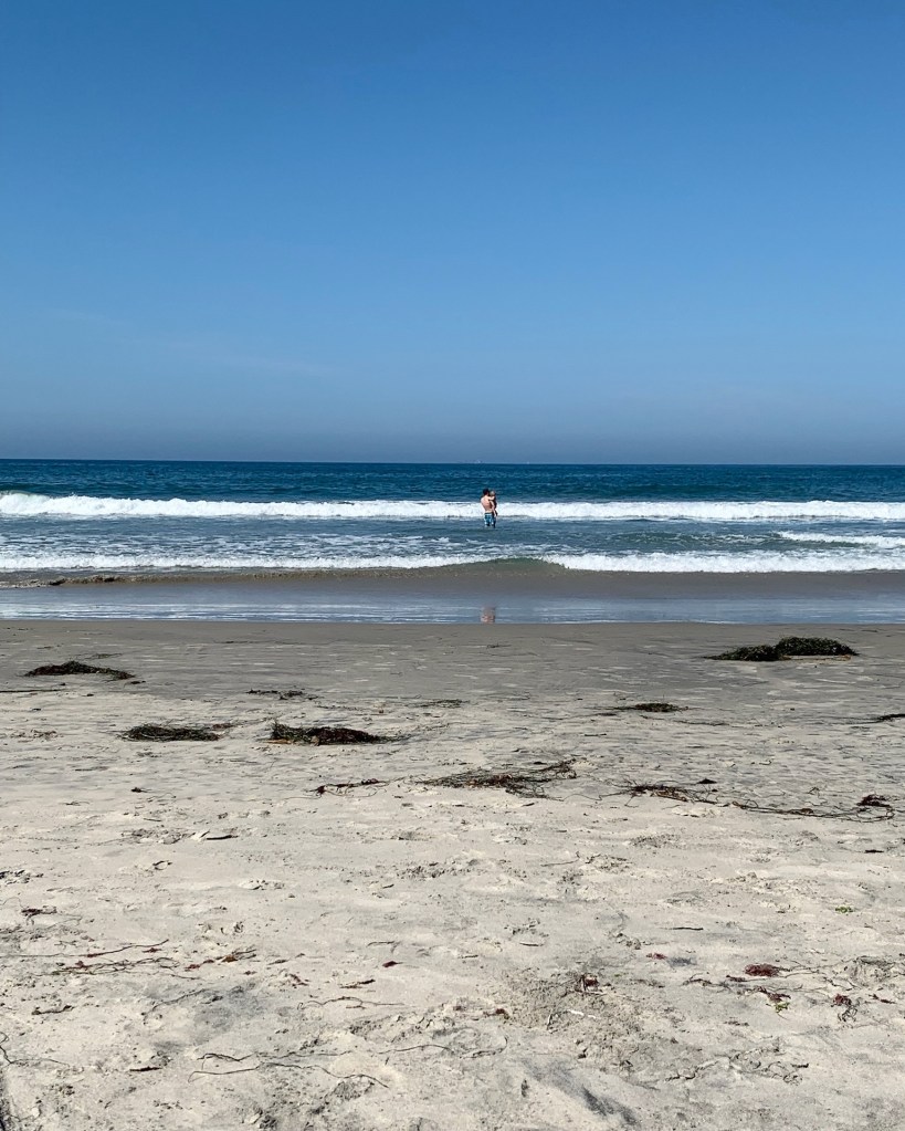 In an attempt to get out of the heat for a bit, we had gone to Sprouts the day before and grabbed some simple snack/breakfast stuff, so we opted to just cook for ourselves that next morning. When in California, you eat as much avocado as you can, right? Dempsey was a fan of his first real avocado toast and Joey got us all drinks from Barefoot Coffee 😍 Afterward, back to the beach! It was Labor Day, so there were lots of people out but it’s not so busy in the morning, luckily. That water felt so cold when you first went in, but it was such a relief compared to the heat. Demps still didn’t want to stand in the water on his own, but he kept telling Joey, “Daddy, run!” and he was having the best time getting hit by the waves. Me and baby girl went into the ocean for a bit, then watched the boys from our beach chair. We hit up a nearby pizza place called Pizza Nova for lunch and it seriously hit the spot. I think I ate a Caesar salad a day on this trip. I just cannot get enough! Put Demps down for his nap and relaxed out front. I told Joey we had to stop putting off baby preparations, so we made a list of the stuff we need to buy/do before baby girl arrives, but that’s about as far as we made it. Luckily, you don’t need nearly as much stuff for the second kiddo but it does feel weird that we did so much planning and decision making and researching for Dempsey and we haven’t done any of that with Baby #2. We all showered once Dempsey was back up — there was no stopper for the tub and honestly, it was so sandy in there anyway, so we gave Dempsey a week of showers and he was NOT happy about it 😂😬 — then headed to Del Mar for dinner. Sat outside at a place called WestBrew, that was out of almost every brew on the menu 🤦‍♀️ But we saw a beautiful sunset and the food was really good. I liked my fish tacos but I just love a soft pretzel, ya know?