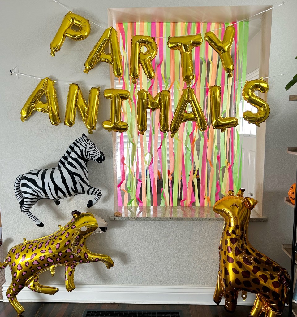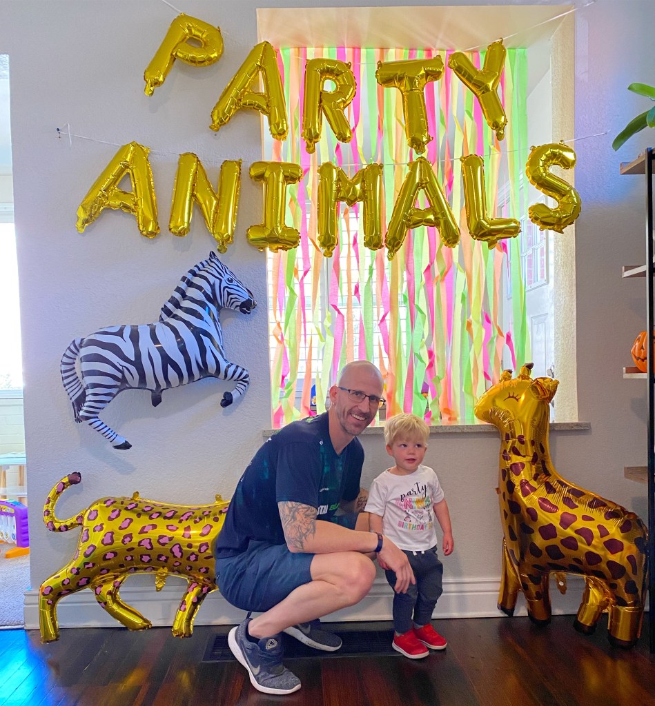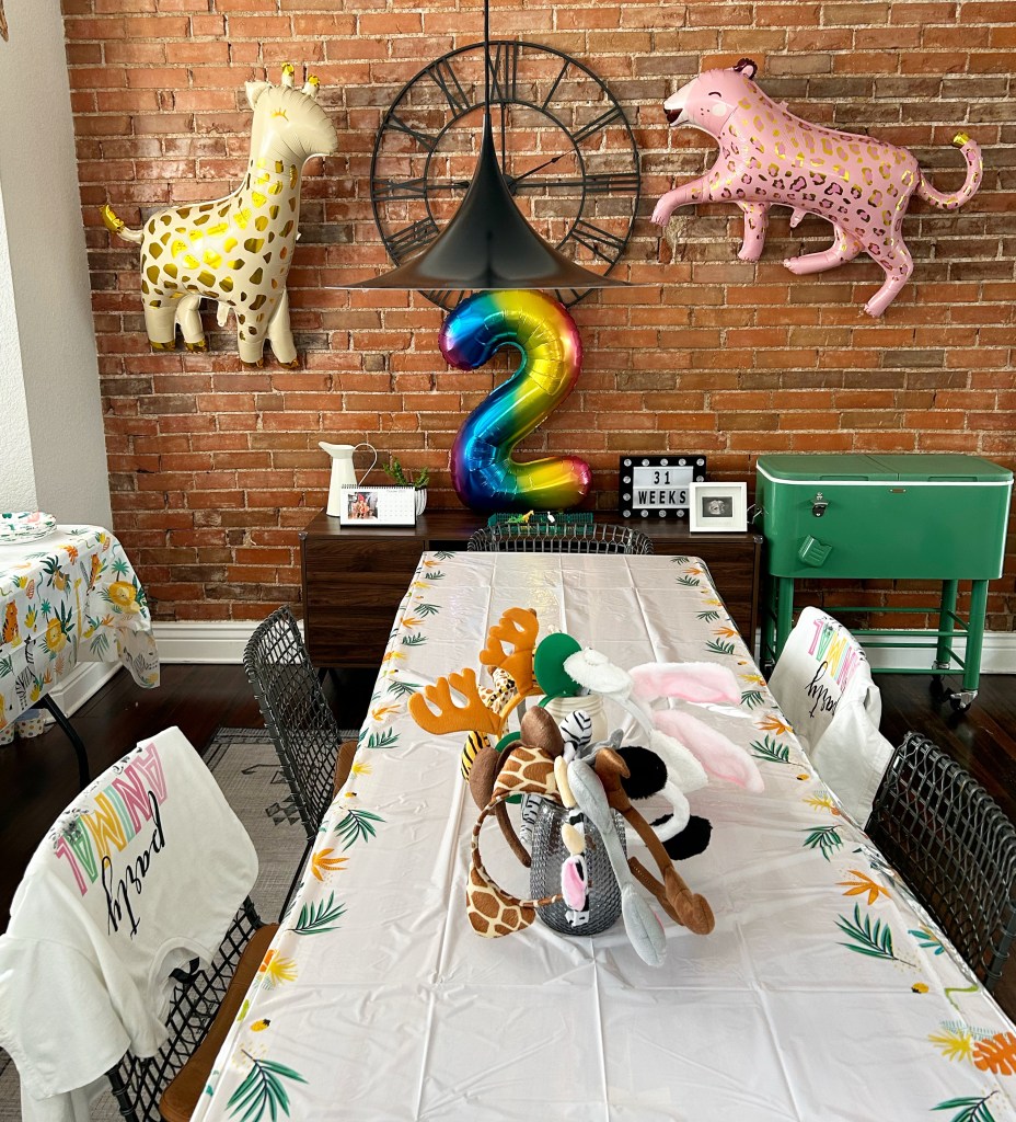 Party time! Demps was still kind of cranky Saturday morning but we hoped the party would make him feel better, or at least distract him š I want to take some credit for all the decor, but it was Joey! He blew up all of those balloons, made and hung that garland and strung all those streamers. I guess I helped pick and buy all of those things a month or so ago, but felt like he really pulled it all together š„°