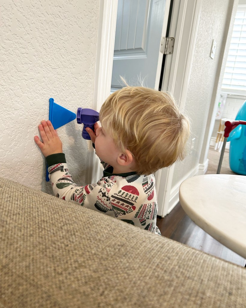 I know every hates falling back because it’s so dark so early in the day, but I love having sunlight in the morning for a little bit again. And not to brag, because I saw so many parents posting about their children waking up super early on Sunday, but this good boy is content to just quietly chill in his crib in the morning, so I have no idea when he woke up! I forgot about this good savory breakfast of leeks, spinach, eggs and feta that I had been really into at the beginning of the year before the first trimester of pregnancy sent me off the deep end. It was as good as I remembered! Meanwhile, Dempsey finished his breakfast, put down his fork and exclaimed “fix the gate!” So off the boys went to finish up their project. I guess Dempsey was inspired because he was trying to hammer this flag into the wall later on 😂