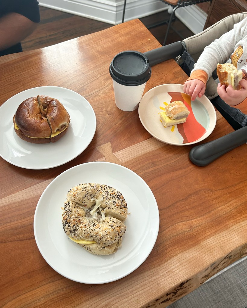 Sunday started with bagel sandwiches. Dempsey and I chilled on the couch while Joey picked them up. I gave Joey some very Sally Albright-esque instructions on what kind of coffee drink I wanted 😂 and Dempsey, of course, wanted a vanilla steamer. Afterward, we hung up all the baby clothes Joey washed on Saturday plus all the bows and headbands we received at the sprinkle and whether she wears them or not, the display is cute! Her mini-crib is housing stuffed animals right now, otherwise, it’s ready to go! Before lunch, Dempsey helped me make cranberry sauce for Thanksgiving. He’s my favorite sous chef!