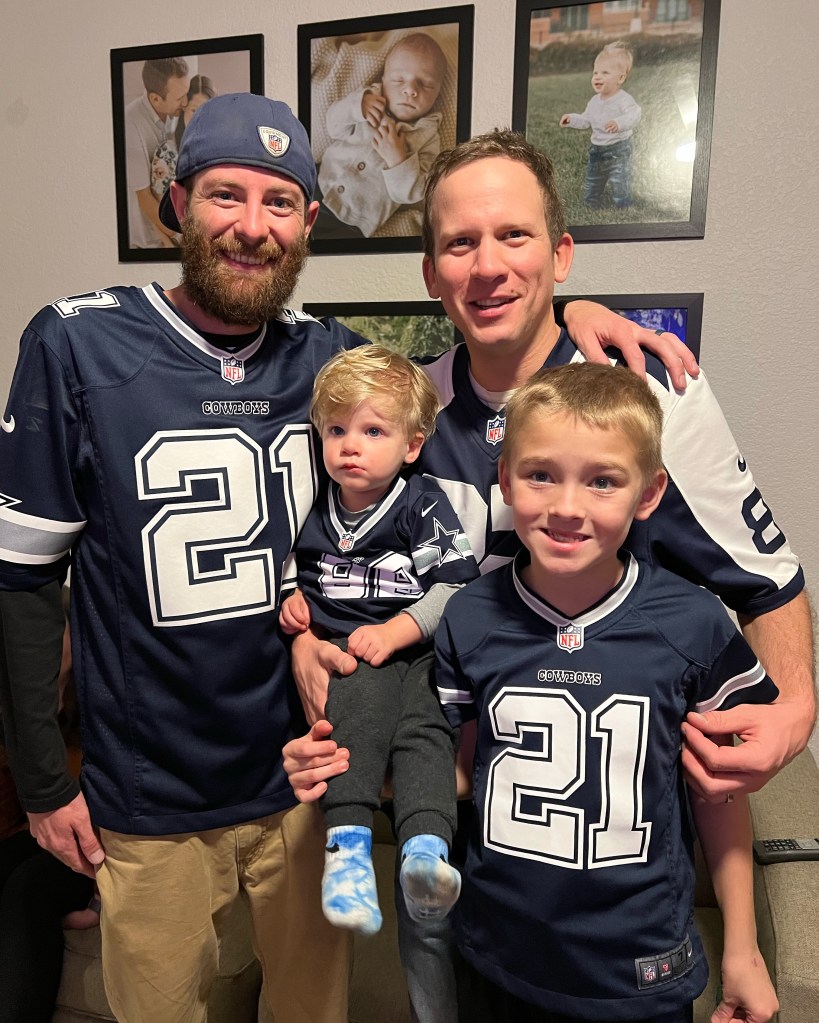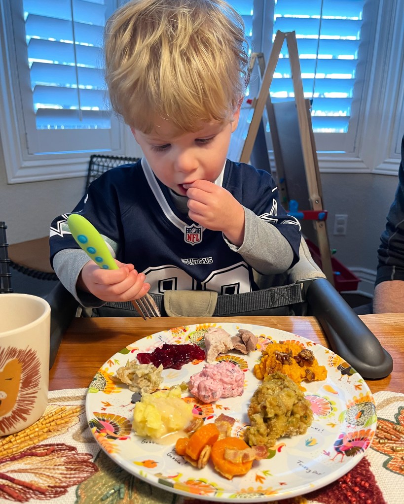 Table set, turkey ready (we did a dry brine with an heirloom turkey this year and I thought it turned out so so good!), Dempsey up and guests arrived, so it was time to eat! Everything tasted so good 🤤 Dempsey was loving the turkey and not much else, but I’ll still call it a win. Tried to get a family photo outside and Dempsey was so hellbent on being put down so he could plug in the inflatable turkey, so most of the pictures were maybe us laughing at him being upset, oops! My sis had on a new engagement ring that my mom and I didn’t notice for close to an hour 🤦♀️ We knew they had bought one but it was still so exciting to see in person and I could not be happier for she and Wayne! Managed to get a group photo this year and then someone was smart enough to get a photo of the boys in their Cowboys jerseys. My sis, Wayne and Lori were last to leave and they had our whole kitchen cleaned up by the time they left, so I’m super grateful for them! Just a really nice day 🤍