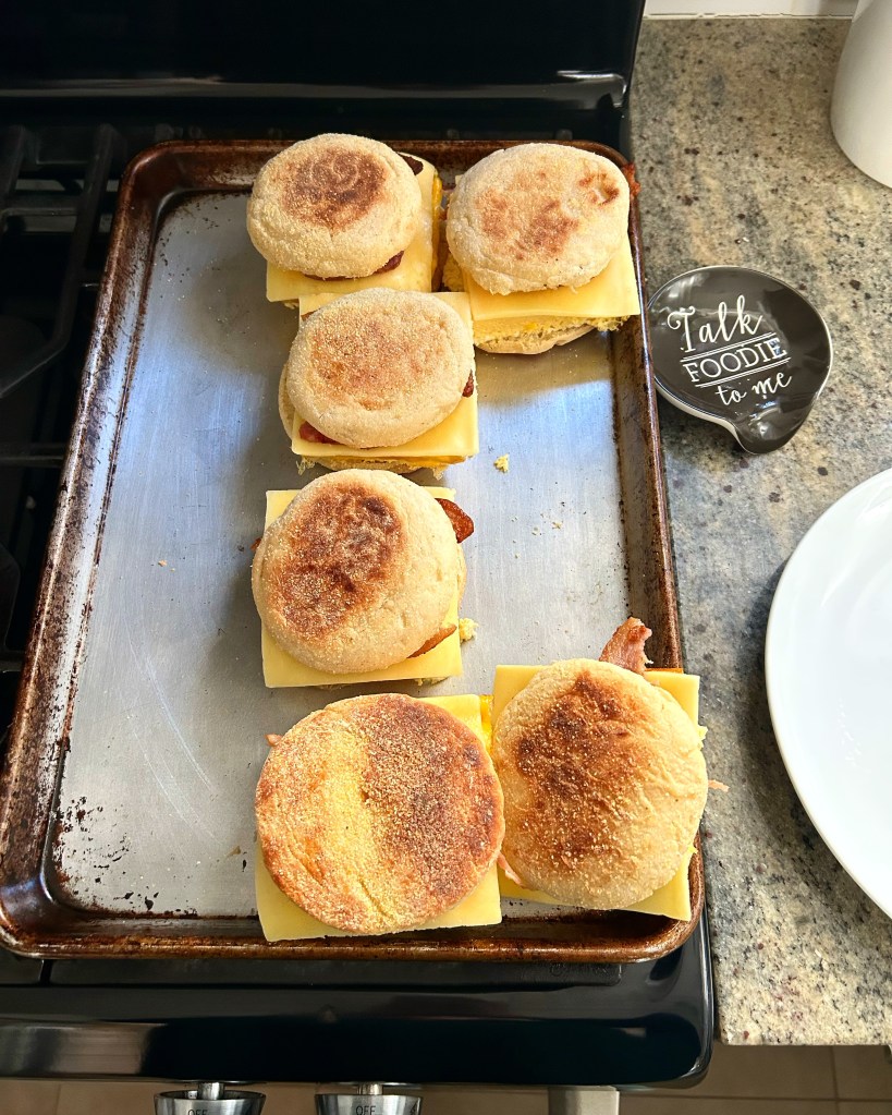 Debated ordering in for Sunday breakfast but opted to eat in and we all wanted something different. “Cream wheat” for Dempsey, an egg sandwich with sausage and cheese for me and hashbrowns, over easy eggs and toast for Joey. The dishes we dirtied though! 😫 I also made some freezer breakfast sandwiches for after our baby girl arrives, so we can have something simple to heat up in the microwave when needed. I baked the eggs and they were so fluffy that these sandwiches were TALL 😂 A little bit later, Joey and Dempsey went on a run then played at the park and shoutout to my husband for not even asking if I wanted to join them because I probably would’ve said yes when I should’ve been resting instead. Read the latest 5280 and some of my current book while they were out and it felt real nice!