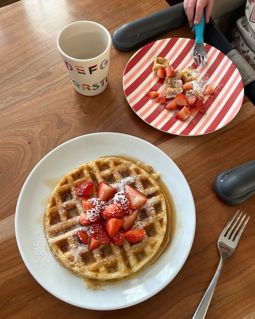 I was in the kitchen mixing up batter for buttermilk waffles on Saturday morning when we got the news that Mason’s party was being postponed ☹ Instead we ate our waffles (plus we made a bunch more for the freezer!), went to Home Depot (Dempsey cried for his juice the entire drive there but was a happy boy again once he had it in his hands) then drove to the park on Tennyson. I stopped into the new Huckleberry Roasters for a coffee then joined the boys and for about ten minutes we kept asking Dempsey if he wanted to go down the swirly slide and he kept telling us “NO!” then he suddenly just decided to go for it and ended up loving it! So cute/fun to watch him come to things in his own time.