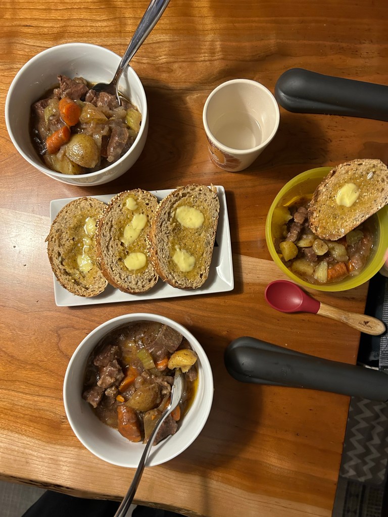 Forgot to get a picture of the super delicious breakfast burritos Hannah, Josh and the boys brought over on Sunday morning but it was so cute seeing the three kids sit at the table together and run wild while the grownups talked and held Lydia afterward. Only a few tears were had while the boys played 😂 Afterward, Demps took a nap and I, buoyed by sleeping in till 8 AM, had enough energy to throw the makings of beef stew into the crock pot and make salads for the week while Joey worked, went on a run and did laundry 💪🏻 That beef stew was the perfect dinner for a frigidly cold night, although Dempsey would only eat it when we called the beef “chicken” and the bread “donuts” 🤷🏻♀️😂 Hope you all had a nice weekend and it’s less cold where you are!