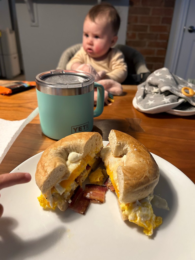 After our later-than-usual Saturday night, we all slept in on Sunday! Joey was still up first, so he made us all egg sandwiches and mine was extra good. Basil mayo, bacon and eggs two ways. I think I’m ruined for bagel sandwiches now! The rest of the day was really mellow. Joey and I did some toy clean-out/reorganization while Lydia napped and then the boys headed out to buy some shin guards, plus a soccer ball and net for Dempsey and then while both kids napped, Joey worked and I made salads for the week. Dress up for sis afterward apparently and then just leftovers for dinner and bedtime for the kids. Joey and I watched some of the Nuggets game, finished Season 3 of I Think You Should Leave and watched the first episode of the final season of Barry (finally!) then went to bed ourselves. Feeling actually rested and ready for the week, what a concept! Happy Monday!