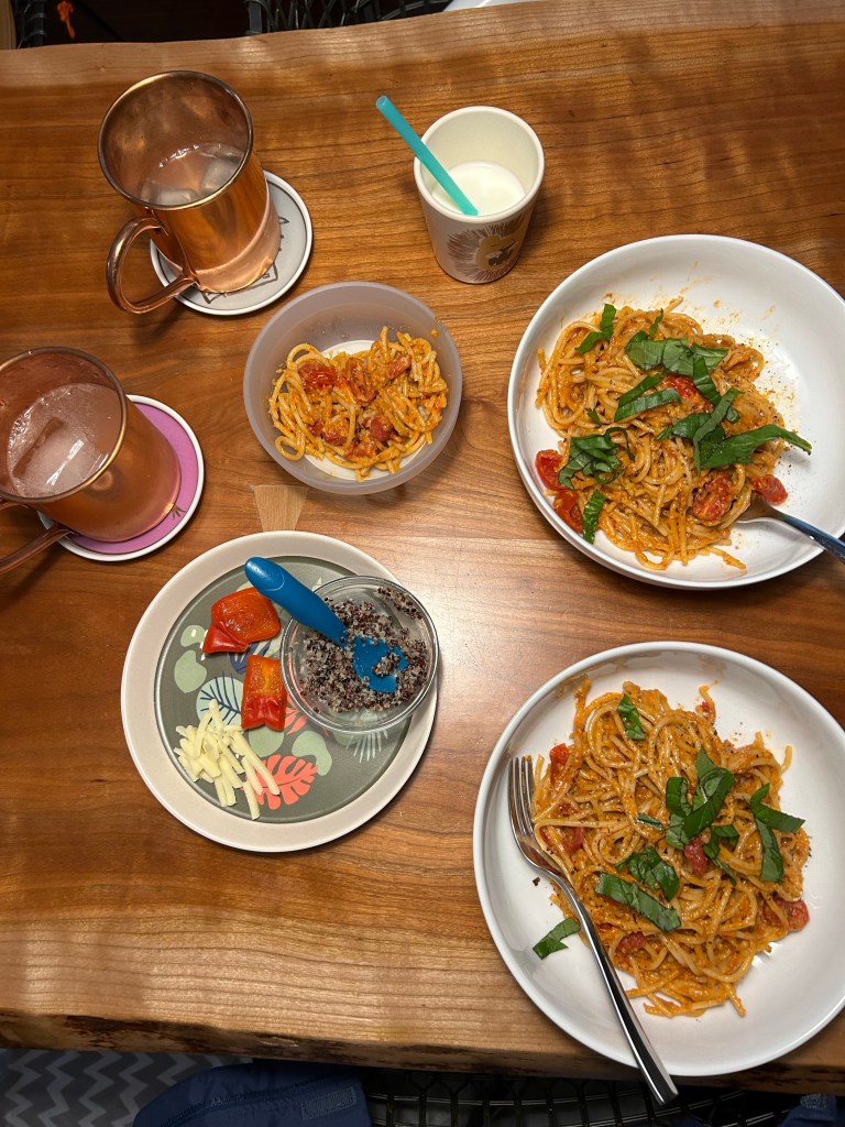 It was cool, cloudy and rainy on Friday and I was happy to have the raincoat my sis and Wayne got me for my birthday while I was out getting a fresh mani. Before all that, I dropped the kids off at Grandma’s and went for a run. My longest yet since rejoining the running world post-Lydia being born! πŸ‘ Once the workday was done and the kids were home, I made us our favorite walnut pesto spaghetti.