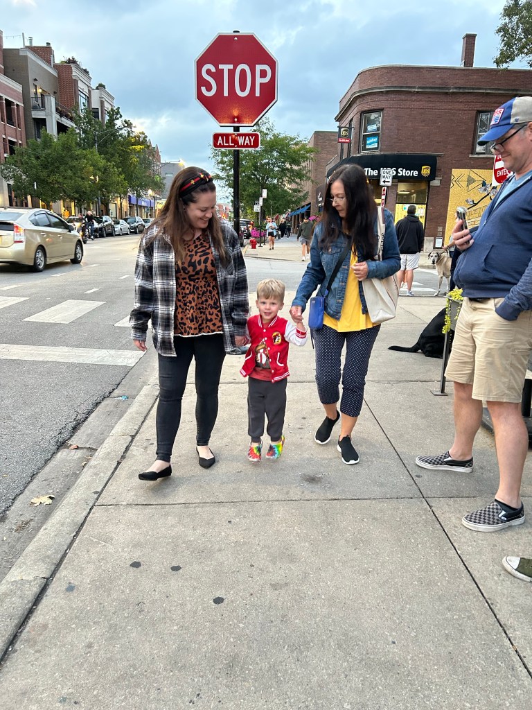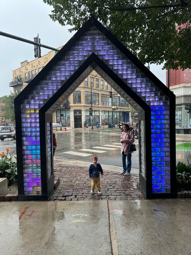 We wanted to save all the good quintessential Chicago stuff for after Lauren, Adam and Landon came in so we had a low-key Friday exploring the Wicker Park neighborhood. Unfortunately it was raining all morning, but fortunately we were armed with umbrellas and found some fun things to do. Had breakfast at Sun Rey CafΓ© and man was it good! Just a little place, that we had all to ourselves, with EXCEPTIONAL service and really delicious food. We walked over to a big record store — Dempsey spent most of the vacation swinging between two people π — stopped at Ipsento Coffee where I had the most delicious honey lavender latte and fed Lyds into a little coma then walked the Bloomingdale Trail aka The 606, an old rail line that’s been converted into a nice path. After the kids got some rest and everyone got cleaned up, we met Emily (who lives in Chicago) and my aunt (who was visiting Emily) at Crosby’s Kitchen. Got a table for our big group right away and the meal was super good! Dempsey ate two chicken legs and every time I looked across the table, Joey was feeding Lydia a bite of mashed potatoes or roasted chicken π It was so nice seeing Em and my aunt and the kids loved it too π Joey dropped Lori, the kids and I off at the Airbnb and headed to the airport to pick up Lauren, Adam and Landon and I waited up for them and chatted for a minute before we all headed up to bed.