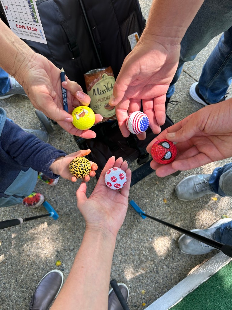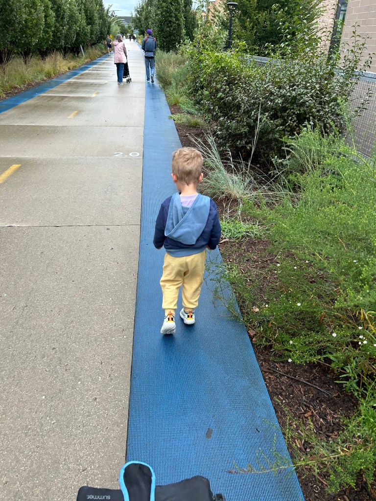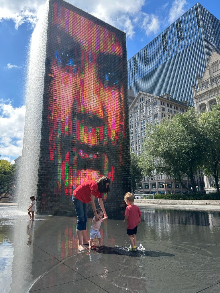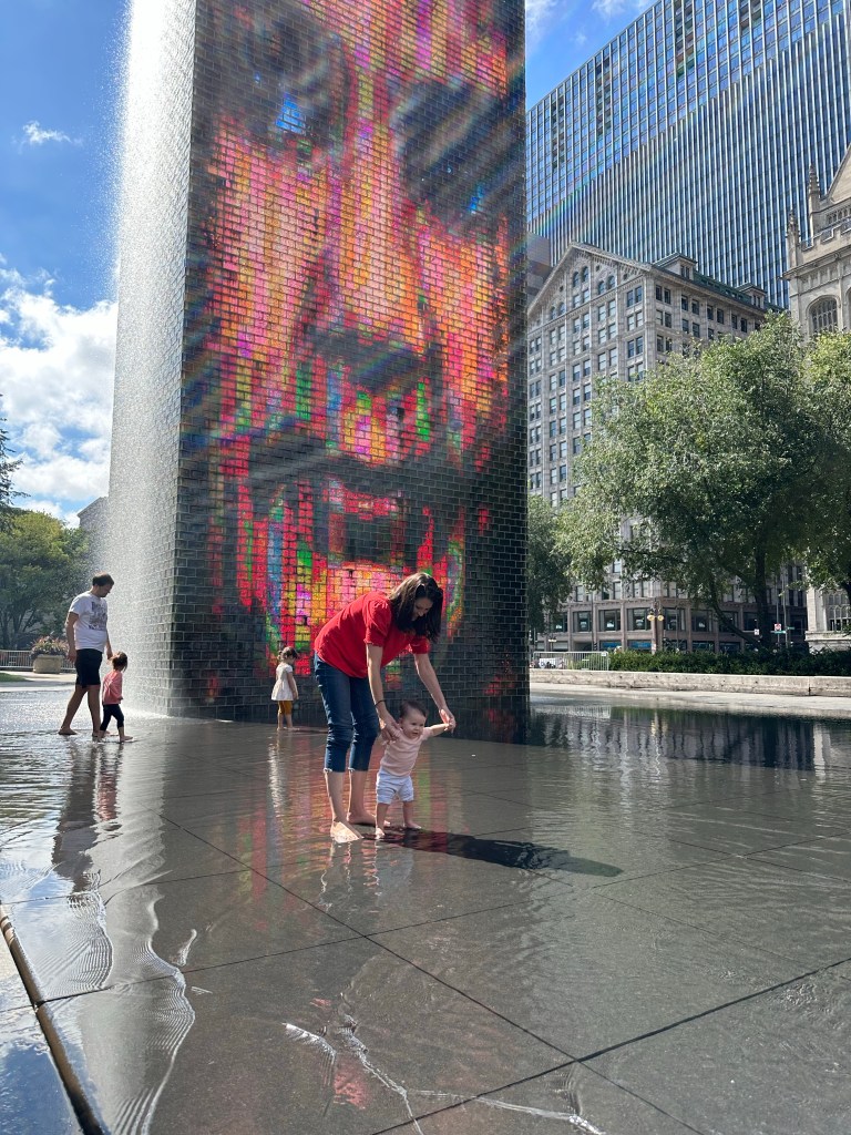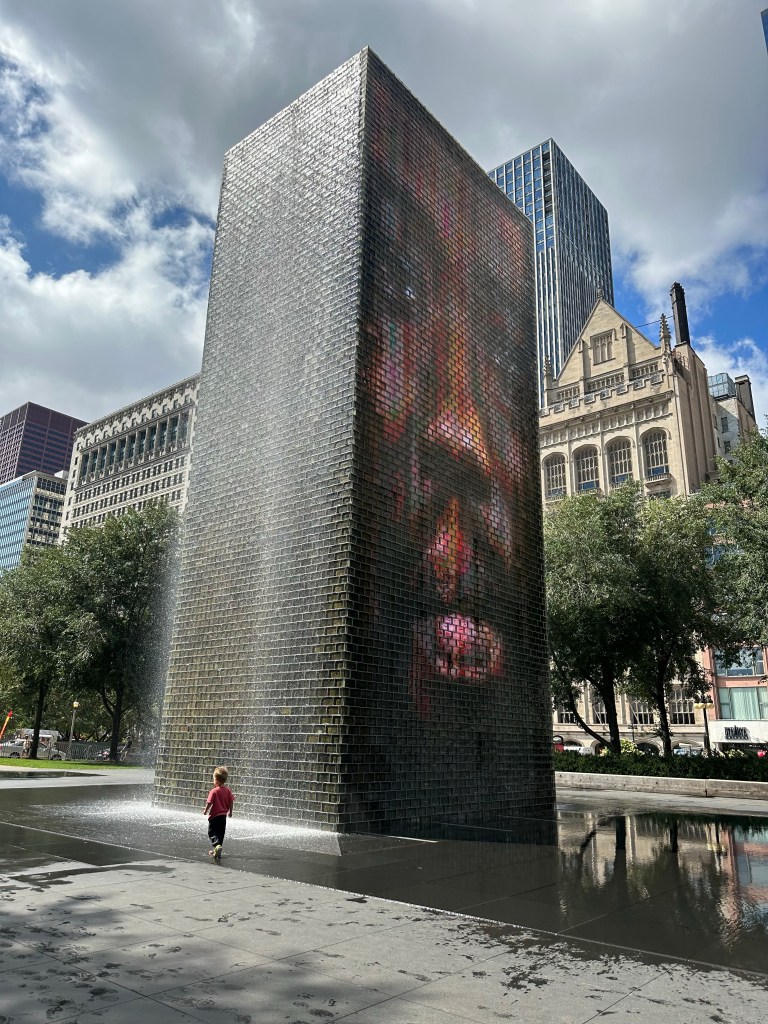 We had planned to have Dempsey sleep in his own room but all those stairs made me nervous and it turned out the rooms were not situated so that we could be on the same floor as him, so Grandma offered to share a bed. I think he only kept her up late every night, asked to go to the bathroom multiple times and woke up at 3:30 AM once, so it went good overall πππ She sent Joey that sleepy head photo on Saturday morning π Lori, Lauren, Adam and Landon had tickets for the Chicago Architecture Center River Cruise at 10 that morning so we tried to grab breakfast at Egg Harbor CafΓ© but by the time we got ourselves ready and over there, there was a 20 minute wait so the river cruisers had to bail and find something quicker. The rest of us were definitely in need of food and coffee by the time we got a table but then we had a nice time just the four of us. I had a really good iced Pumpkin Spice Latte! After, we walked through the city, along the river for a bit then over to Millennium Park. Dempsey was having a BLAST running around in the water at Crown Fountain and actually so was I π I told Joey to never forget I AM a water sign! Once the rest of the group had joined us we got a quick peek of The Bean (it’s fenced off for paver replacement right now!), grabbed some very glamourous concession stand Chicago Dogs and hit up City Mini Golf. Someone was tired and kind of lost interest in actually putt putting half way through but we had fun. For dinner, we drove out to Oakbrook to meet Chris, Amanda, Carmen and Zach for dinner and OY, THE CHICAGO TRAFFIC! Took over an hour to get there but otherwise, we had a very lovely time. Ate at Alter Brewing + Kitchen and very nearly finished a 1.5 pound pretzel. By the time we go home and got everyone into bed it was 11 PM!
