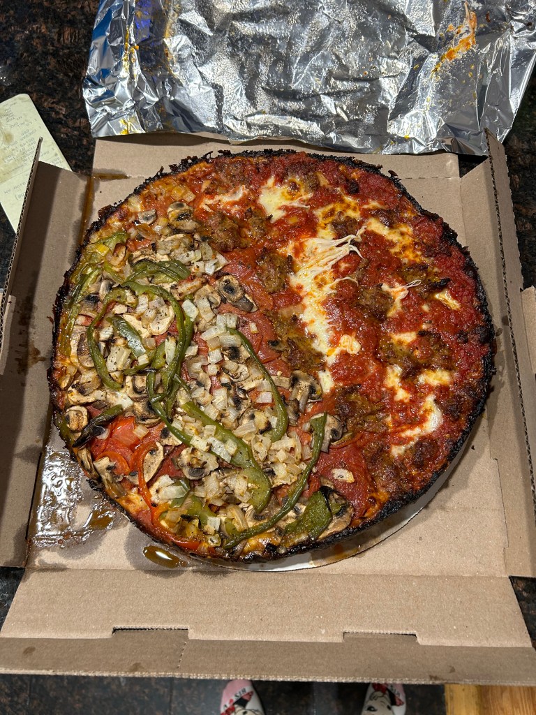 Joey, Lori, Demps, Lyds and I flew out Thursday afternoon and why’s it take your whole day to travel, even when you’re not going that far? By the time we got into O’Hare, walked a million miles to baggage claim, picked up our rental car and drove to our Airbnb, it was dinnertime! The kids did good on the flight though. Demps watched a movie and our party girl didn’t want to sleep and stayed up the whole time. I scheduled pizza pick up for us knowing we’d be tired from traveling all day and the kids not napping like usual. Went with Pequad’s and it was alright. We stayed in the Lakeview neighborhood and liked the location a lot, though we had a three story unit and no bathroom on the first floor so lots of stair climbing.