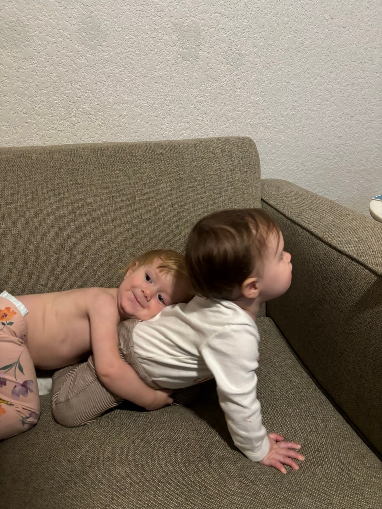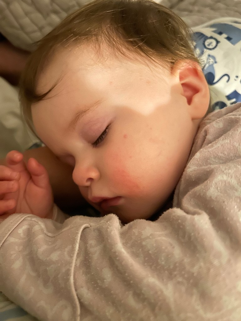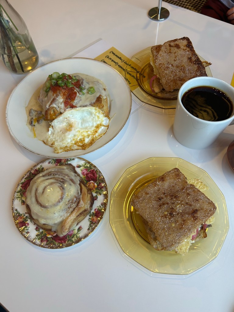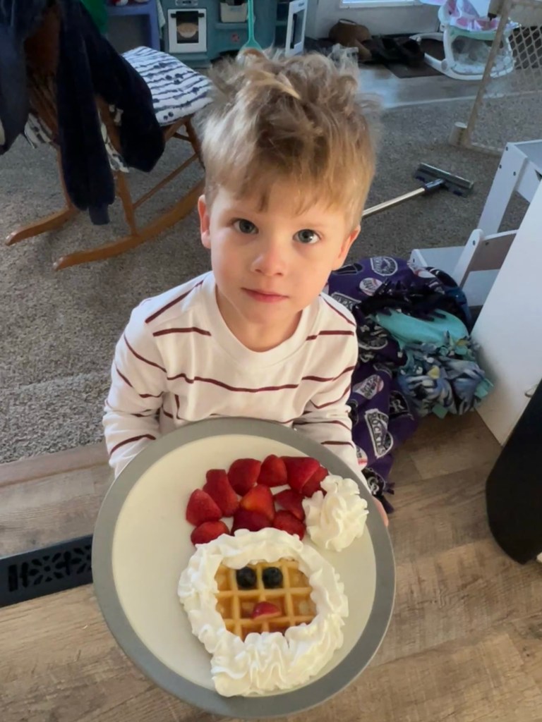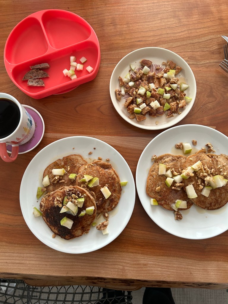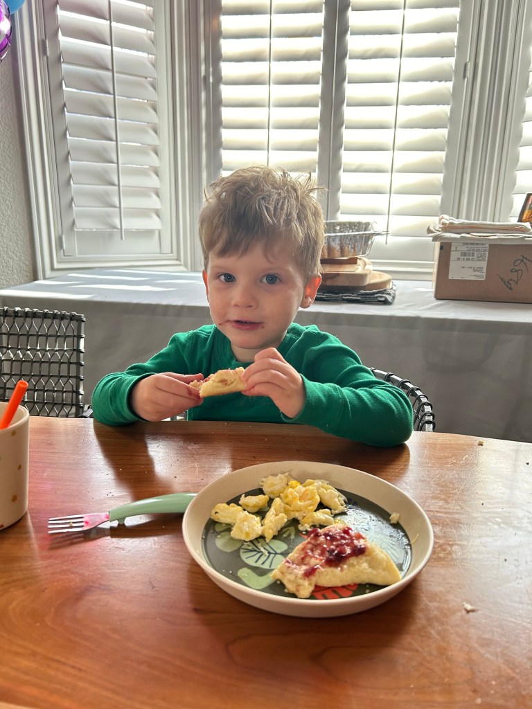 I guess our girl enjoyed being an only child for a night because here she is, still in her own bed, asleep at almost 7 AM! Now if only we could get her to sleep like that when Dempsey is also in there… We had talked about having breakfast at Onefold, but I’d been awake at 3 AM with the worst stomachache (it’s like you’re not supposed to eat a huge meal with alcohol and dessert three nights in a row! 😬) and I didn’t think I should push it, so we opted for just a normal breakfast at home. We got a photo of Dempsey’s breakfast though and he is one lucky boy! I headed over to pick him up before lunch and it seemed like he had a fun night with Grandma 🤍 Both Joey and I made ourselves turkey sandwiches for lunch except that his took 2 minutes to put together and mine involved turning on the oven. If that’s not an accurate portrayal of who we both are, I don’t know what is.
