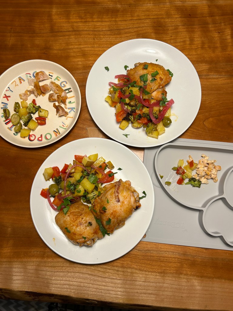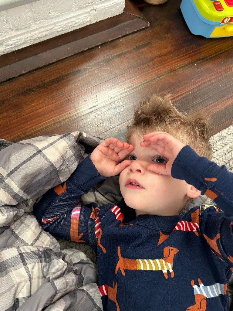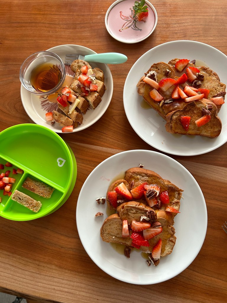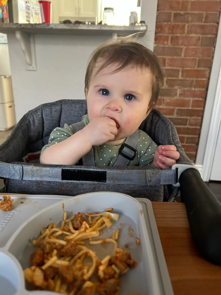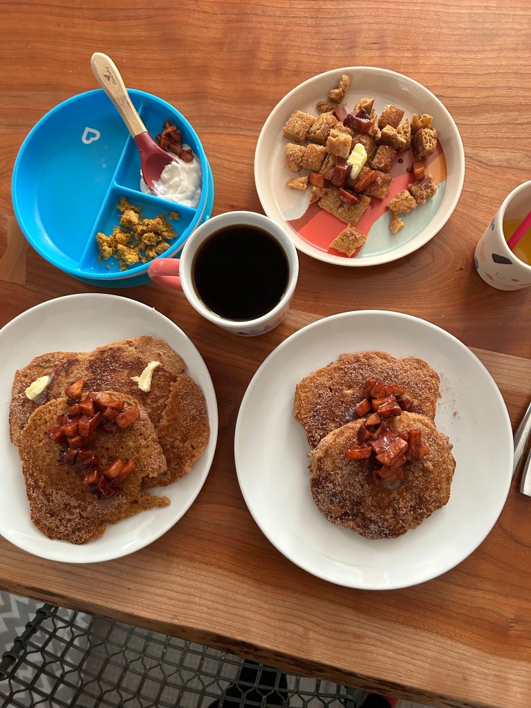 Woke up and made us all French toast. Both my kids were completely infatuated with the salad spinner while I was cooking 😂🤷🏻♀️ Lydia took a nice long morning nap so I was able to take Dempsey to his swim lesson and back home without her even knowing I was gone (Joey was home with her obviously!). In the afternoon, both Joey and I got in a run, both kids got in a nap and we got some indoor and outdoor clean up done. Made sheet pan chicken and veggies for dinner and it was a hit with everyone 🙌🏻 For a while there, dinner was a chaotic twenty minutes of Lydia standing up in her high chair and Dempsey throwing food but we got a new chair for Lyds and the message seems to finally be sinking in with Dempsey so dinner is almost peaceful again?? ✊🪵 Afterward, Demps wanted popcorn and how could we saw no?! After the kids went to bed, I watched GBBO and Joey took a nap 😂 and then we watched the beginning of SNL and went to bed ourselves.