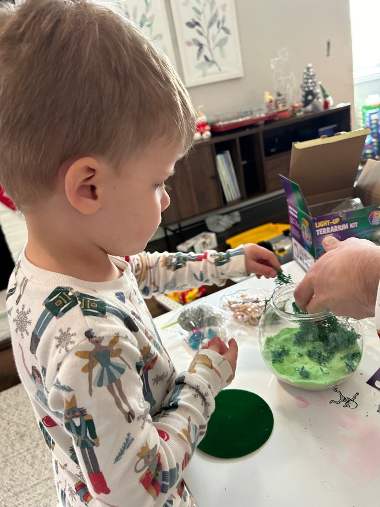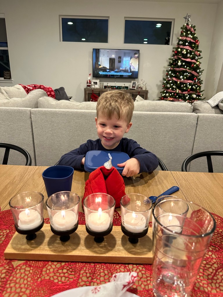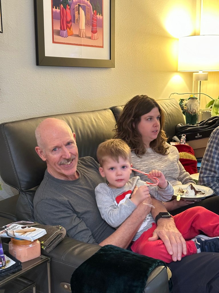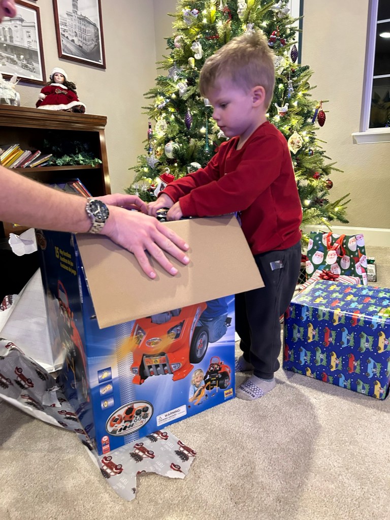 Christmas Eve! We took our little gnome and hot chocolate lover to breakfast and I always wonder if people without kids are looking at us like we’re insane to bring two small children out to eat. It’s just being climbed on, keeping knives and glasses out of small hands and trying to eat your meal while also holding or feeding someone else 😂 We must be crazy because we just keep doing it! Afterward, more playing with the car toy, then Lydi took a nap and Dempsey helped me make cookies for Santa ❤ Thank goodness we weren’t hosting anything at our house because I let my 3-year-old have full control over a shaker of sprinkles and I’m sure you can imagine what the counter looked like afterward. At 4, Grandma Lori and Chad came over to surprise the kids with their Christmas present. Dempsey was so excited and so am I!