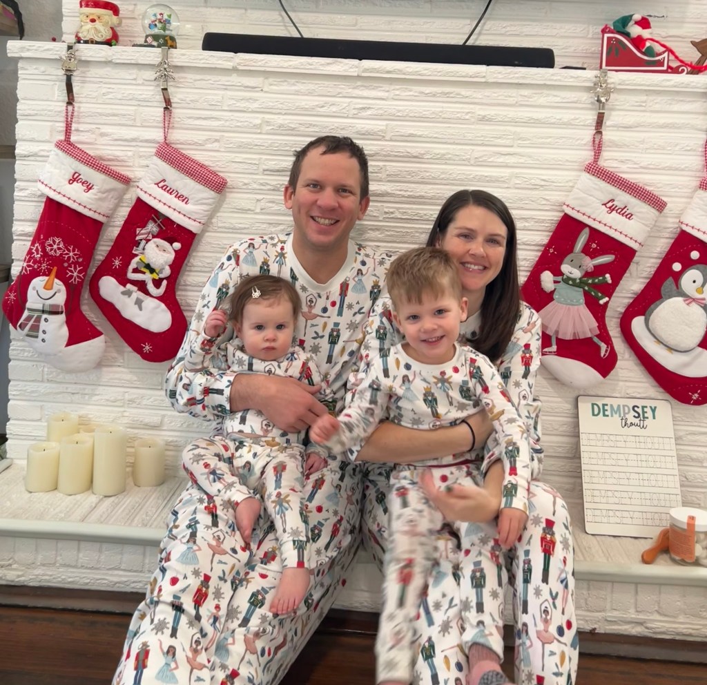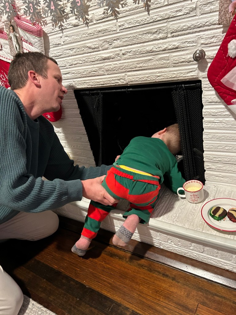 We spent the evening at Adam, Lauren and Landon’s for a Christmas Eve panini party and movie night and we all had so much fun! Dempsey ran around like a psycho, Lydia ate a bacon-wrapped date, Landon got a big hug from his cousin and was the smiliest. Plus matching cousin jammies 😍 Dempsey chose the 2018 version of The Grinch and Lydia was NOT into photo time but she did at least make it through the whole movie. Back at home, we put out our cookies and eggnog for Santa and tried to get a picture of the kids but Lydia was TIRED. Joey told Dempsey that he used to always look up the chimney for Santa before he went to bed on Christmas Eve, so obviously Dempsey had to look too.