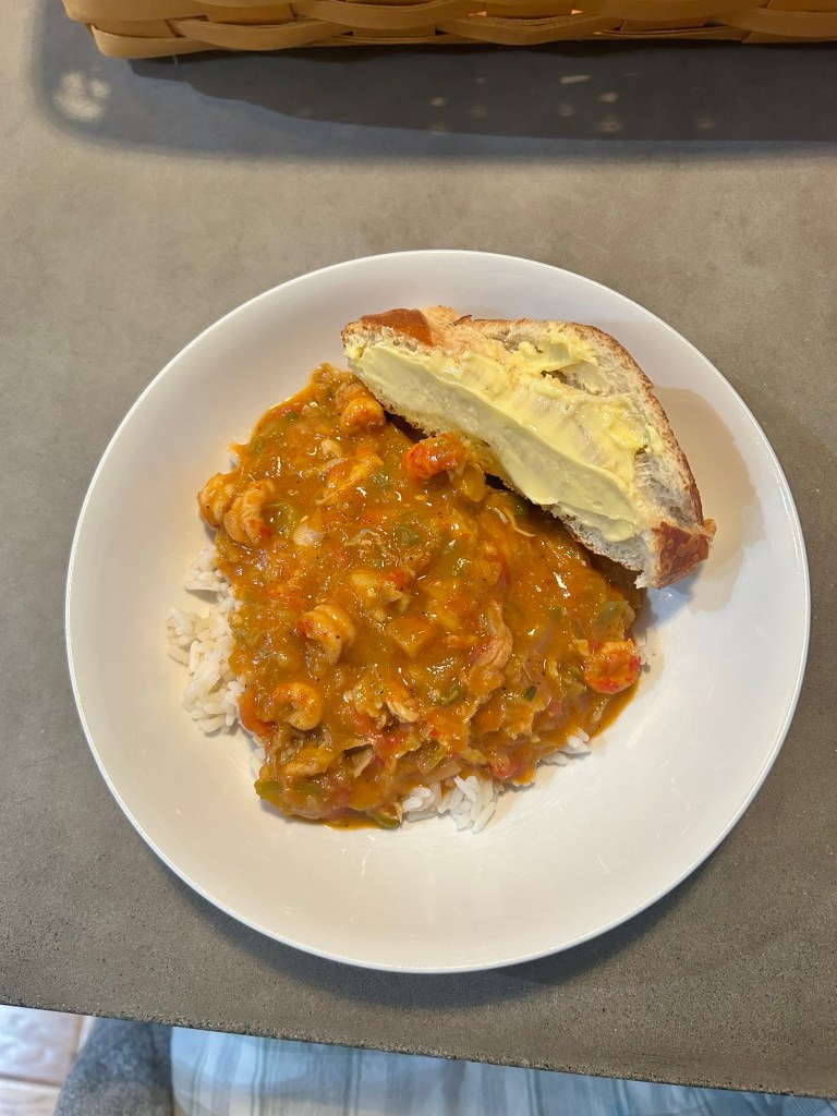Picked up breakfast from Sunny’s on Sunday morning and even though I was originally disappointed by how little green chili there was on my skillet, it actually tasted really good. Joey took the kids and Dempsey’s motorized car across the street to play and I knocked out salads for the week all before Lydia’s first nap! While she was down, Dempsey and I took a walk to the Cottage Bakery for croissants then ate them outside with the neighbor kids, who are always good enough to include Dempsey even though they are both older than him. After lunch, we took the kids to another busy park. Dempsey was so brave and wanted to ride the zip line. By the time we left, he was flying across all by himself and loving it! We headed over to my parents’ that evening for dinner. My uncle had shipped fresh crawfish meat and my mom used it to make Γ©toufΓ©e. It was a little spicy for the kids, but I thought it was really good! We had dessert then headed home, but it was a really nice night π€ Got both kids to bed — Lydi has been STRUGGLING at bedtime the past week or so (because of teething I think!) but she finally went down easy — and then we worked on our Dune re-watch. Dune 2 this Friday!!!!! Wishing you all a happy week π