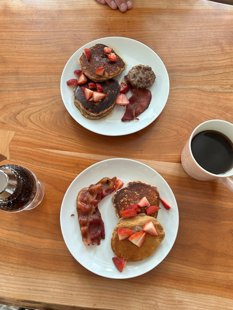 I can’t believe how I literally cannot remember how any of us slept on any given night. Does that mean my brain is broken or just that none of it is worth worrying about? Who’s to say! I think Joey and… one of the kids was up earlier than me and the other one so he had pancake ingredients set out already when I came down. Sissy helped me mix up the batter (aka eating the batter from the spatula and crying every time she wanted more 😂) and then we all sat down and ate them. A little doughy for my liking but they had almond butter in them because: Lydia passed her almond food challenge last week!!!!!! 🎉🎉🎉 I honestly had been preparing my heart for her to have an immediate reaction to it, but she had absolutely no issues and seemed to love eating it too! I’m so happy. She can have almond butter & jelly sandwiches, almond milk, almond yogurt, almond flour, almond anything now!