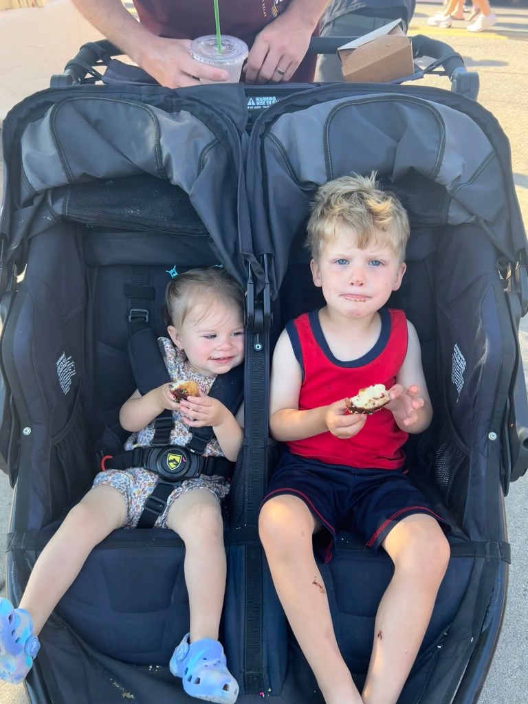 A happy happy Sunday! We had a quick and easy breakfast before heading out to the Farmers’ Market. Got some strawberries & tomatoes, plus pink lemonade and a donut for the kids. It was gluten free and I’m sorry, but it was the strangest texture π Back at home, much playing, movie watching and chore doing before I left to get my hair cut. When I got back, the neighbor kids were asking for Dempsey, so he and Joey went over to play and then Lydi and I joined when she was up from her nap. I had some beef in the crock pot and had made a strawberry simple syrup earlier in the day, so tacos and margaritas for dinner! It all turned out really good and Dempsey was straight spooning pico de gallo in his mouth (which is interesting considering he complains about onions being in anything else π€·ββοΈ). Tried to get in a game of Chutes & Ladders after dinner, but the kids ran away and Joey and I played by ourselves. For the record, I won π Got those babies to bed together again (!!!) and watched the penultimate episode of The Crown. I can’t believe we’ve almost finished, I didn’t think we’d ever get there.
