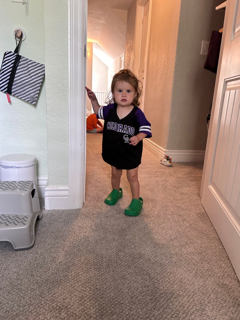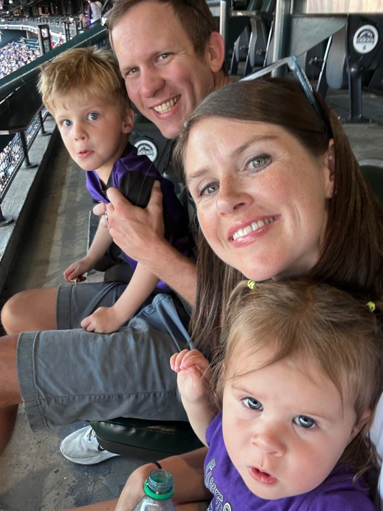 The Rockies had reached out and offered us seats inside of the suites and how could we say no?? It was really nice in there and I love how family friendly the organization feels. The staff is so good with the kids and made sure we knew Dinger would be coming to visit later on. We grabbed something to eat then went out to our seats, where I paid zero attention to the game but had a fun time anyway 💜 Dinger did come visit later on, accompanied by Grimace and The Hamburglar. Dempsey saw Grimace and said “I don’t wanna see that potato man!” 🤣🤣🤣 I thought Lydi might be scared but when we zoomed in on the picture later, we noticed she was holding Dinger’s hand 😍🥺 It also happened to be Todd Helton Weekend and they were doing a drone show tribute after the game. I didn’t know if I was up for staying till the very end of the game, plus the time it would take to walk down onto the field and back to the car but then Dempsey was SO EXCITED about it that, again, how could we say no?? He was beside himself getting to go down on the field again and clapped every time they set fireworks off. It was seriously the sweetest and I’m so glad we stayed. Got those babies home and in bed then got into bed ourselves. What a fun night!