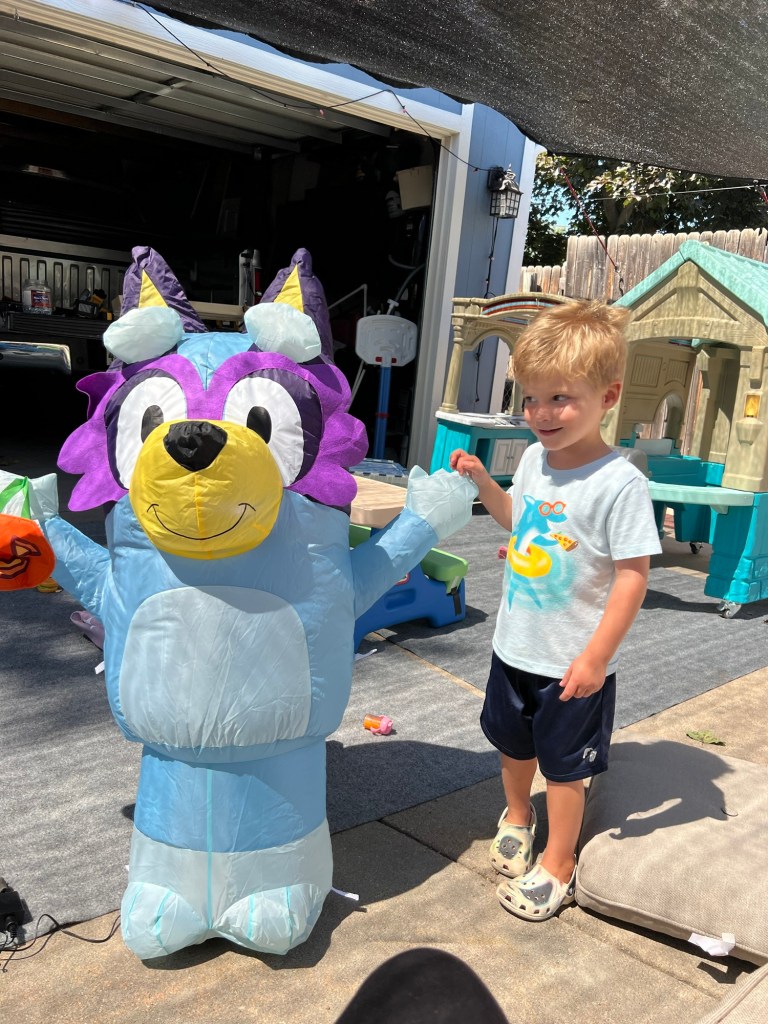 I had a Friday morning mani scheduled and Dempsey told me to get “bright blue, not that white color, like last time!” 😂😂 Lori and Chad took the three kiddos to a bubble exhibit and it looked like they had the best time. I watched an episode of Jimin and JK’s travel show, so I was having the best time too. Lori also sent me a photo of their newest inflatable, a Bluey-dressed-as-Janet-the-grannie and I think it’s safe to say Dempsey is in love!