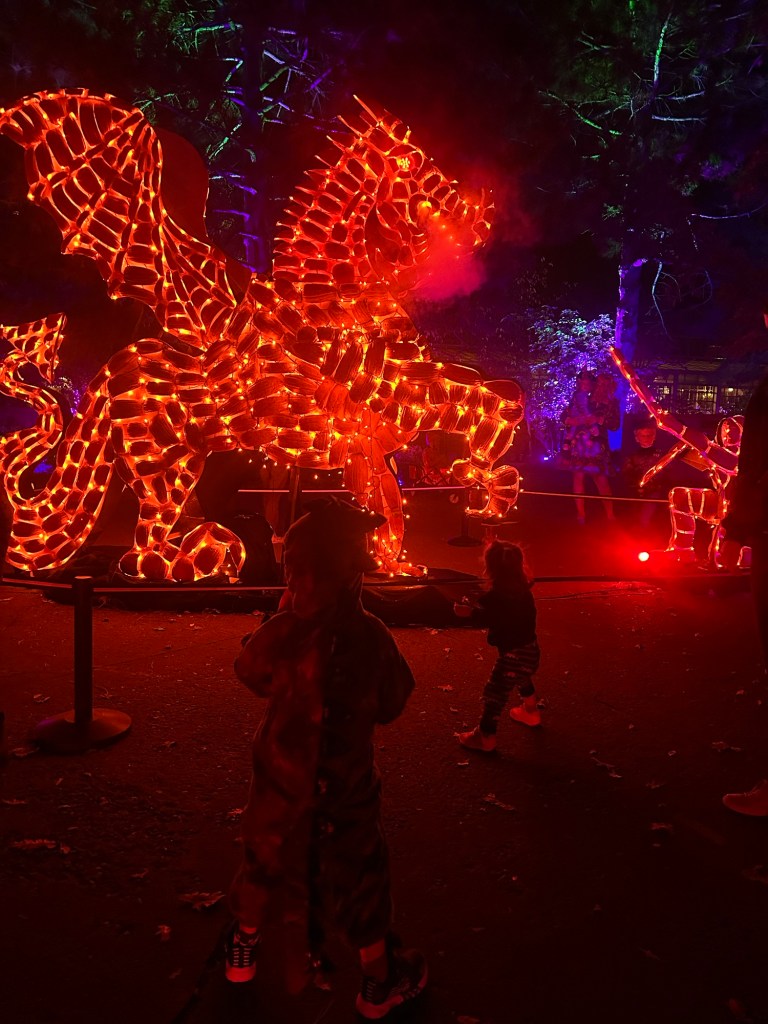Glow at the Gardens! No joke, Dempsey has been talking about this for months. He really is my son π We got there shortly after 6 PM and had no trouble finding a parking spot, so that was a good start. My little Stage 5 Clinger wouldn’t let anyone but Mommy hold her, so we had a nice little bonding time π She was literally chattering away and singing “this is Halloween, this is Halloween!” the entire time. She’s too funny! Demps seemed to have a blast too. He got spooked by a walking tree, saw his beloved Headless Horseman and even high-fived a skeleton guitar player π And Lydia blew the Headless Horseman a kiss π€£π€£ They were so tired and loopy by the end, but it was worth it. Dempsey fell asleep in the car on the way home and the first thing he asked me this morning was “are the decorations still up at the Botanic Gardens?” He’s too sweet. Till next year, Glow at the Gardens!