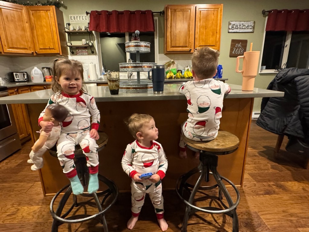 We picked Dempsey up from school Friday afternoon, then swung by Grandma Lori’s to get our girl and headed up. We turned Lydia’s car seat around, so now she can watch TV on the iPad too (long drive only, I swear) and it was the most peaceful car ride I’ve ever had with these two 😂 We got there right as Uncle Adam, Auntie Lauren and Landon were unloading from their car, so it was pretty good timing. We went out for pizza at Antonio’s and I thought it was all very very good! A pizza robot delivered our food! The kids were running around a bit too much, otherwise it was a very good time! Back at home, the kids got into their matching pajamas courtesy of Auntie Lauren and we tried our best to get a photo of them all together before bed time 😉