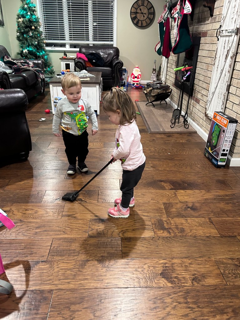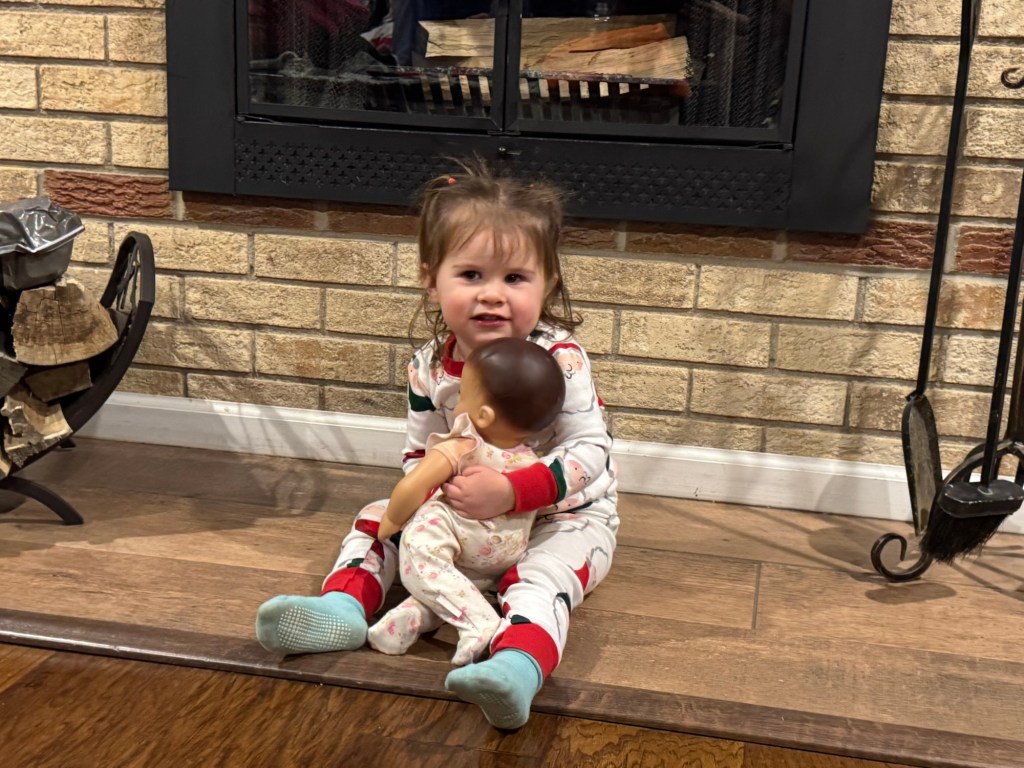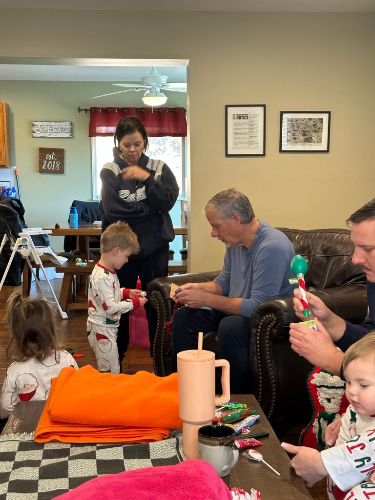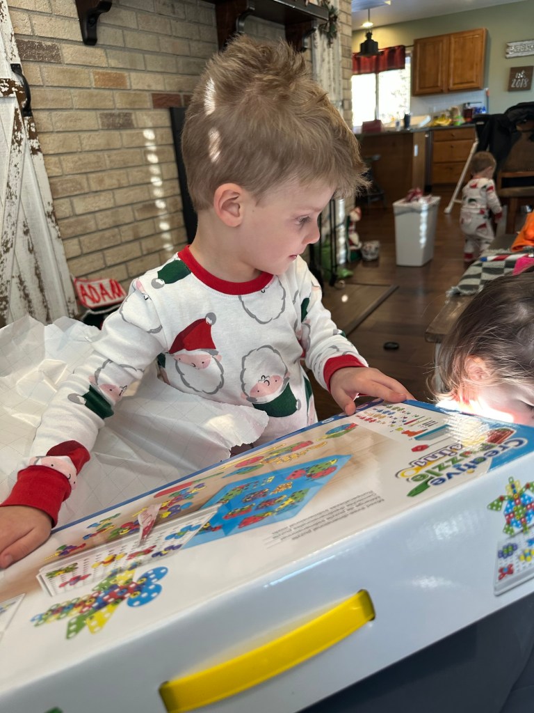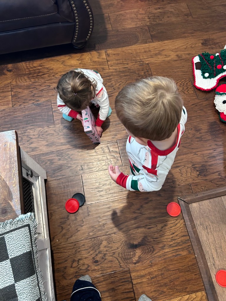 Lydia had a ROOOOOOUUUUUUGGGGGHHHHH night of “sleep.” She was battling a cold all week and kept waking up coughing. At 1 AM, I finally got up to bring her into our room but she could not get comfortable laying down, so we spent the rest of the night singing, watching Frozen, trying to explain why we couldn’t wake “Buddy” up and nearly pulling our hair out. Fun times 🥱 Dempsey was awake at 5:45 (whyyyyy) and I slept a little bit while Joey entertained the kids and then we all made our way downstairs around 7. I made us a sheet pan pancake and bacon and then after Dempsey asked about a million times to open his stocking, we did presents. The kids got such fun stuff and the adults too!
