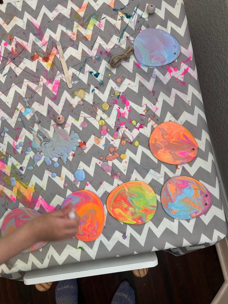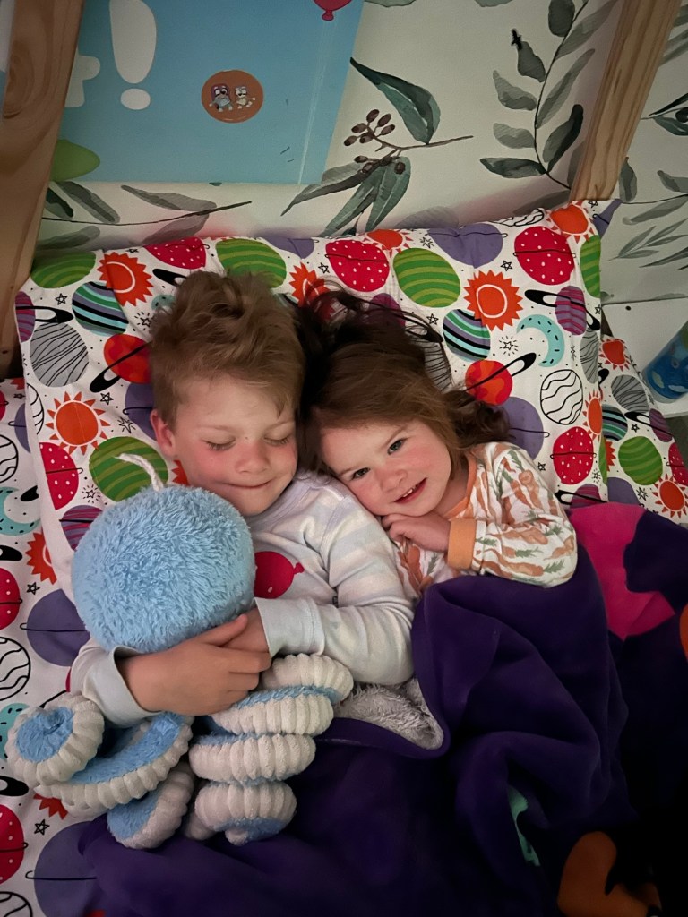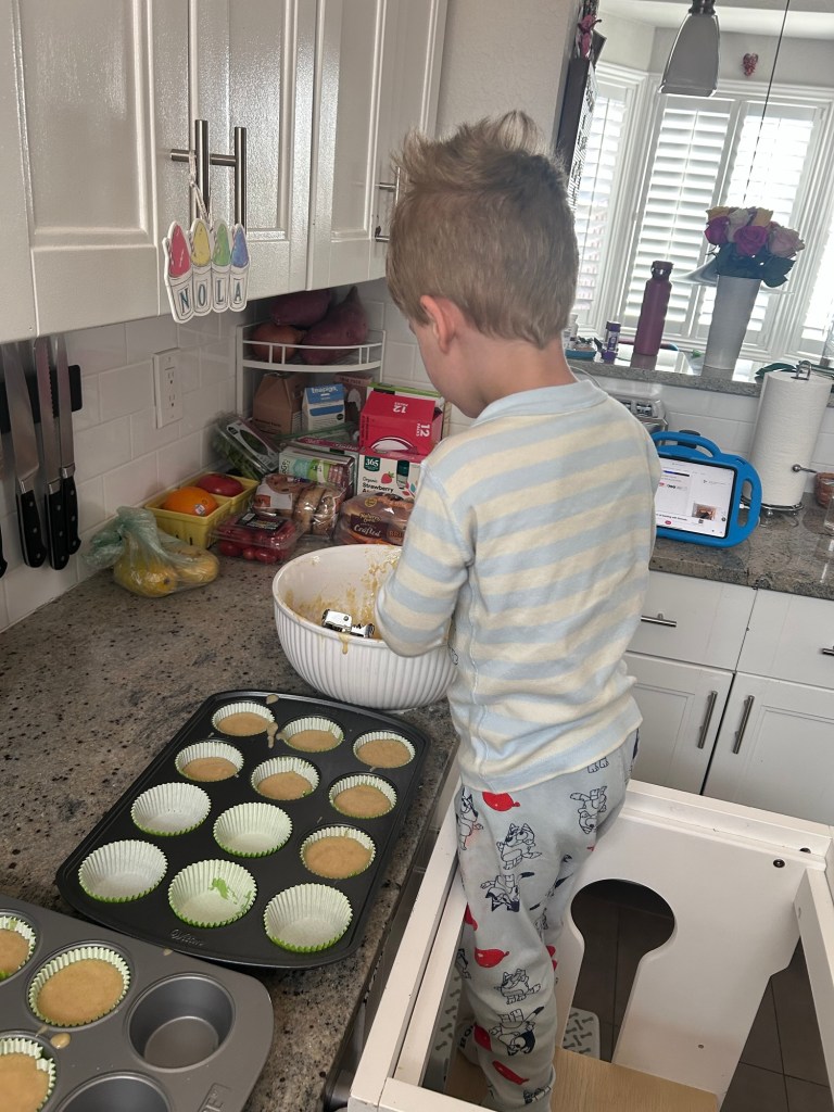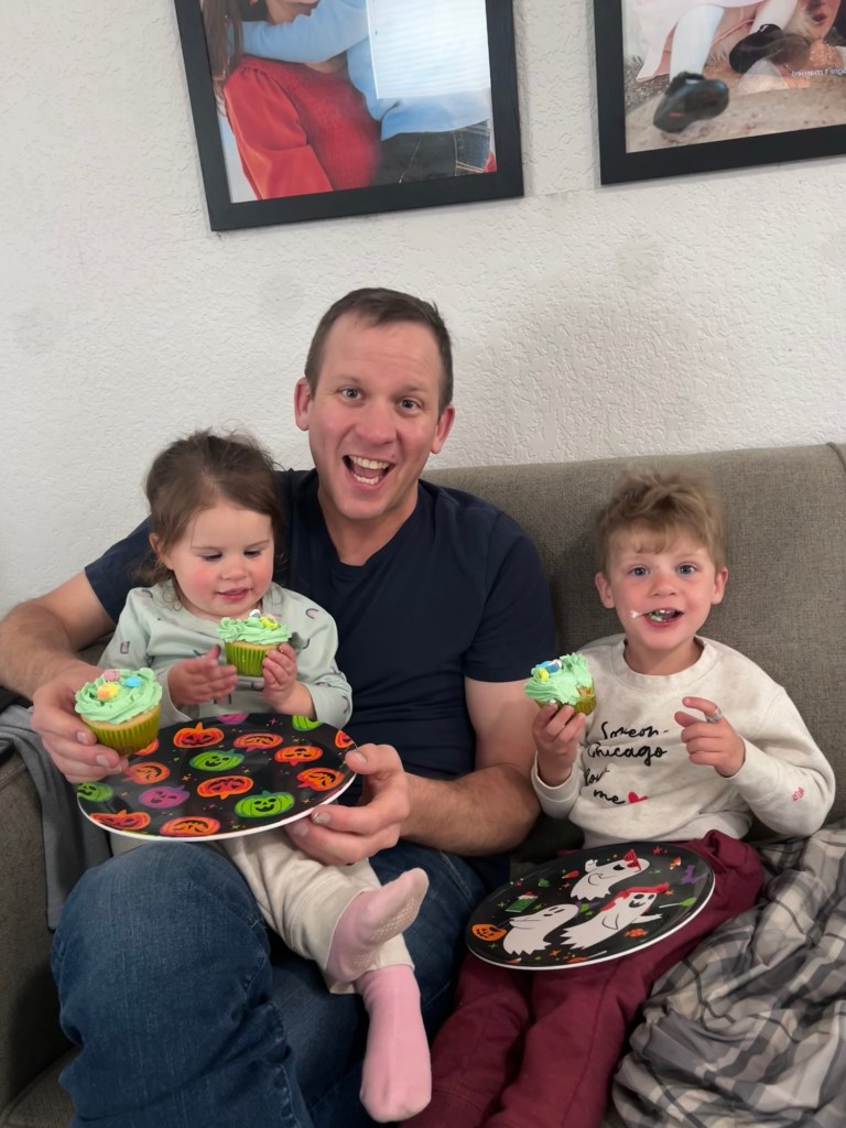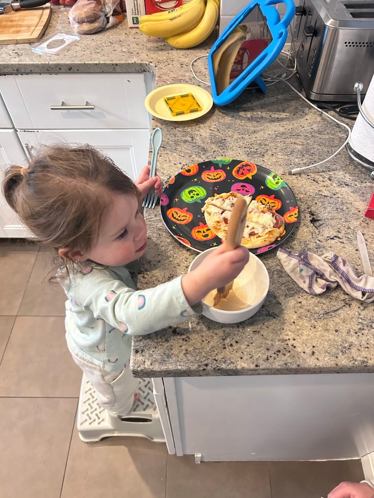 Back at home, the kids helped me make the green frosting and then we all got to have a cupcake snack. The kids definitely just ate the frosting and marshmallows off the top though 😂 For dinner, we made naan pizza (we were UP in the kitchen this weekend!) and how cute is Lydia putting honey on her own pizza crust? We finished up Ron’s Gone Wrong and started Moana 2 before putting the kids to bed. TWO-year old no nap Lydia is definitely less of a mess than FOUR-year old no nap Dempsey but she was loopy at bedtime. They both were asleep in minutes!