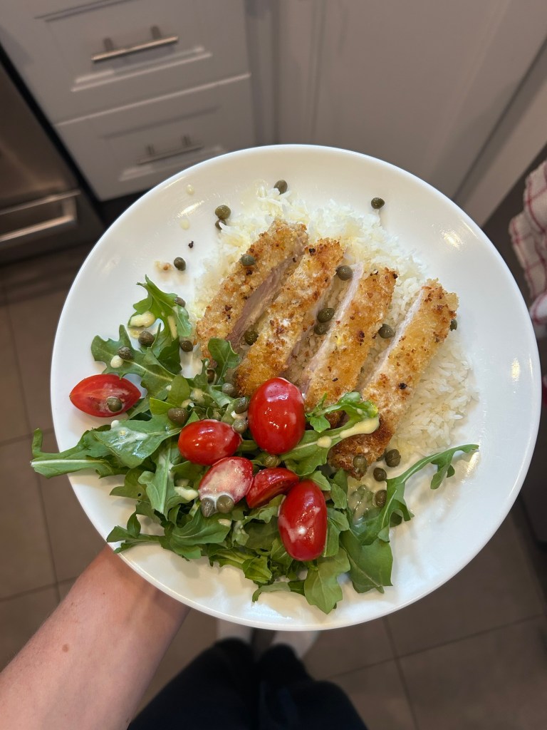 We all slept in on Sunday, then had overnight oats for breakfast. I whipped out salads shortly after, then hung with our kids and the neighbor kids while Joey did some more planting in the front yard. Around 11, Aunt Bean and Uncle Wayne come over to watch the kids, so Joey and I could go to the symphony again! We told Dempsey we were going without him this time but there would only be music and no live animals, so it would be a little more boring π We had lunch at The Hampton Social before and it was really good! As for the symphony, it was a really fun and interesting experience, even if most of the other people in the audience were… ahem, older π We got home around 4 and it seemed like everyone had a fun time and were tired! The kids and Joey watched a movie while I made us all dinner. Been waiting to make Pork Milanese for when we were sure Lydia wasn’t allergic to egg, so it was time and it was worth the wait! So good. We got them bathed and off to bed before starting the newest season of Hacks. I made it through 3 pages of my book afterward, I was so tired π
