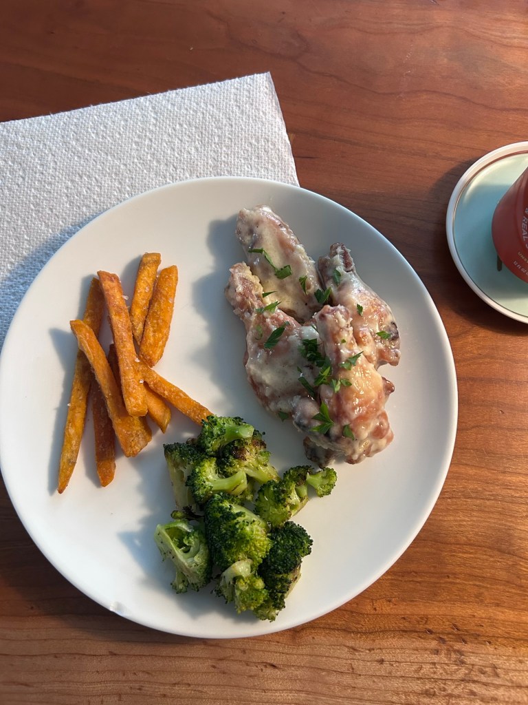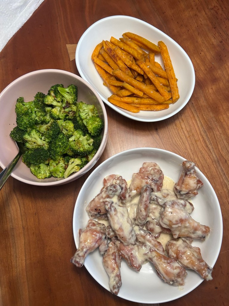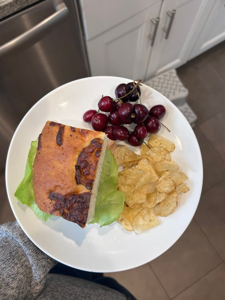 Dempsey woke up screaming about something or other at 3 AM and woke his sister up, so guess who slept the rest of the night in our bed? π€ͺ At least she went right back to sleep and let us do the same. We all slept in till after 8! Unheard of! Once we were all finally up, I made us some buttermilk ricotta pancakes that were so soft and delicious. Afterward, we loaded the kids into the stroller and headed to the farmers’ market. First stop, popsicles, of course and then we walked through and left with cherries, tomatoes, garlic scapes, a bouquet of flowers and a loaf of focaccia. Used the bread for lunchtime sandwiches and we all loved it! While Lydia napped, I made salads, Dempsey watched Phineas & Ferb and Joey did laundry and then once that little girl was up, Joey took them outside to play so I could work out. I made wings for dinner and homemade garlic parm is just the best! Sweet potato fries and broccoli to go along with. I think Lydia ate three wings, which is awesome because she’s usually not super into them. Got them both bathed and into bed before watching a couple episodes of Deli Boys.