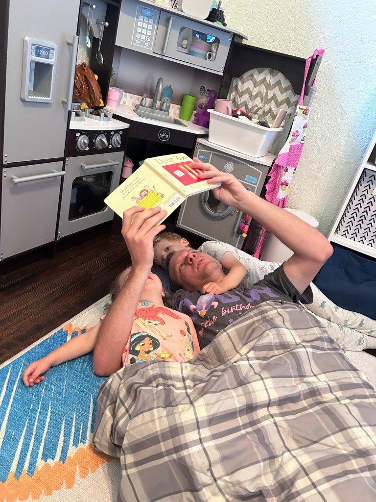 So proud of my big boy Demps going into the water without his floatie and down the slide a million times too! He’s not always the most water-confident, so this felt big to me. We all had a great time and I’m so glad we got to go again this summer. Afterward, Lori took the kids home for nap/quiet time and I went home to pack our overnight bag. Once the kids and Joey were all home, we loaded up the car and headed into Georgetown. It was the kids’ first stay in a hotel! We took our stuff up to our room then hightailed it to dinner at Cabin Creek Brewing. We sat outside near the lake, which was just as well because the kids were running around like maniacs. Went down to the lake for a bit then went back to our room and watched a bit of The Bad Guys before deciding the kids should go to bed. Lydia finally gave up her shenanigans and went to sleep at ten till ten ð
