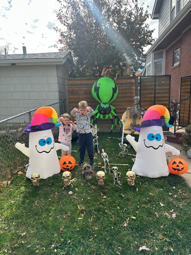 We had talked about going out for breakfast the next morning but with the time change, we woke up at 6 AM 😅 Opted for slow-cooked eggs at home instead! I worked out then headed to pick up the kids, while Joey blew out the sprinklers and cleaned up leaves. We took a pic of the kids with our Halloween yard decor since we forgot to do it when we first put it all out and then we “swapped” it out for our turkey blow up. “Swapped” because all of that Halloween stuff is now set up in our backyard, thanks to Dempsey 😂