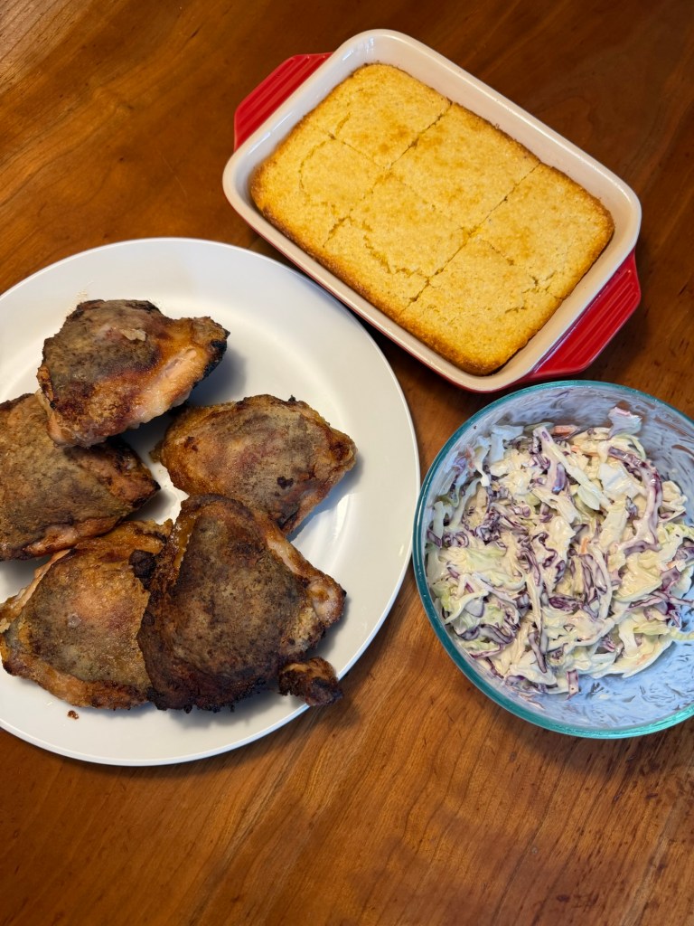 I had like seven things on my personal agenda, plus some work before Lori brought the kids home that afternoon. We took them across the street to play outside for a bit and then she took off and I made us sweet tea oven-fried chicken with cornbread and coleslaw for dinner. So good! Afterward, our two played in the backyard with the neighbors until bedtime. Joey and I watched the season finale of The Pitt and it felt kind of lackluster, no?