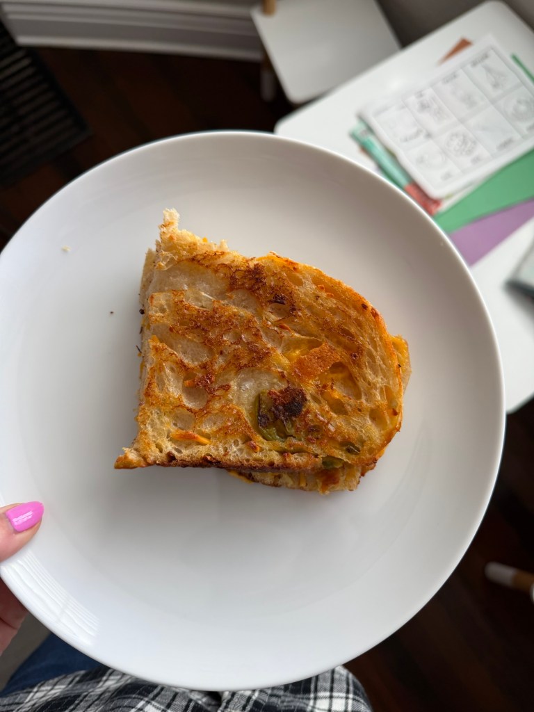 Woke up Saturday with a sore throat for what feels like the tenth time already this year 😫 We had whole wheat buttermilk pancakes and then I took Lydia to her swim lesson and ran a few errands afterward. Back at home, grilled cheese on my freshly baked jalapeno cheddar sourdough 😍 It was my first time with mix-ins! Lydia was acting so crabby so I put her down for a nap and she was none too pleased to be woken back up later. Took them to ride around in their cars just to get outside for a bit and I think it brightened everyone’s mood despite the chilly weather. We ordered in Ginger Pig for dinner and it hit the spot! Got the kiddos bathed and to bed before starting No Other Choice.