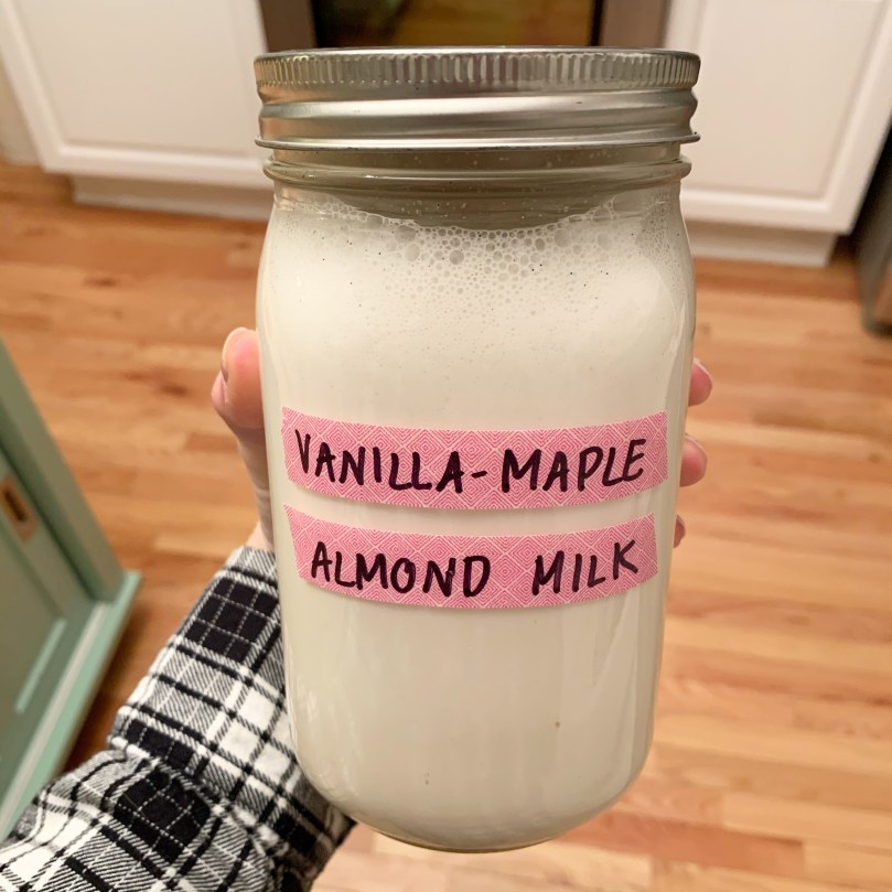 Thursday night, when Joey was off at bowling, I made a batch of vanilla-maple almond milk and couldn’t wait to use it for our Saturday morning lattes.  It frothed so perfectly and tasted amazing, so I couldn’t have been happier.  (Please note my “latte art” in Joey’s mug, ha!)  And Joey made us pancakes after he woke up earlier than me ♥