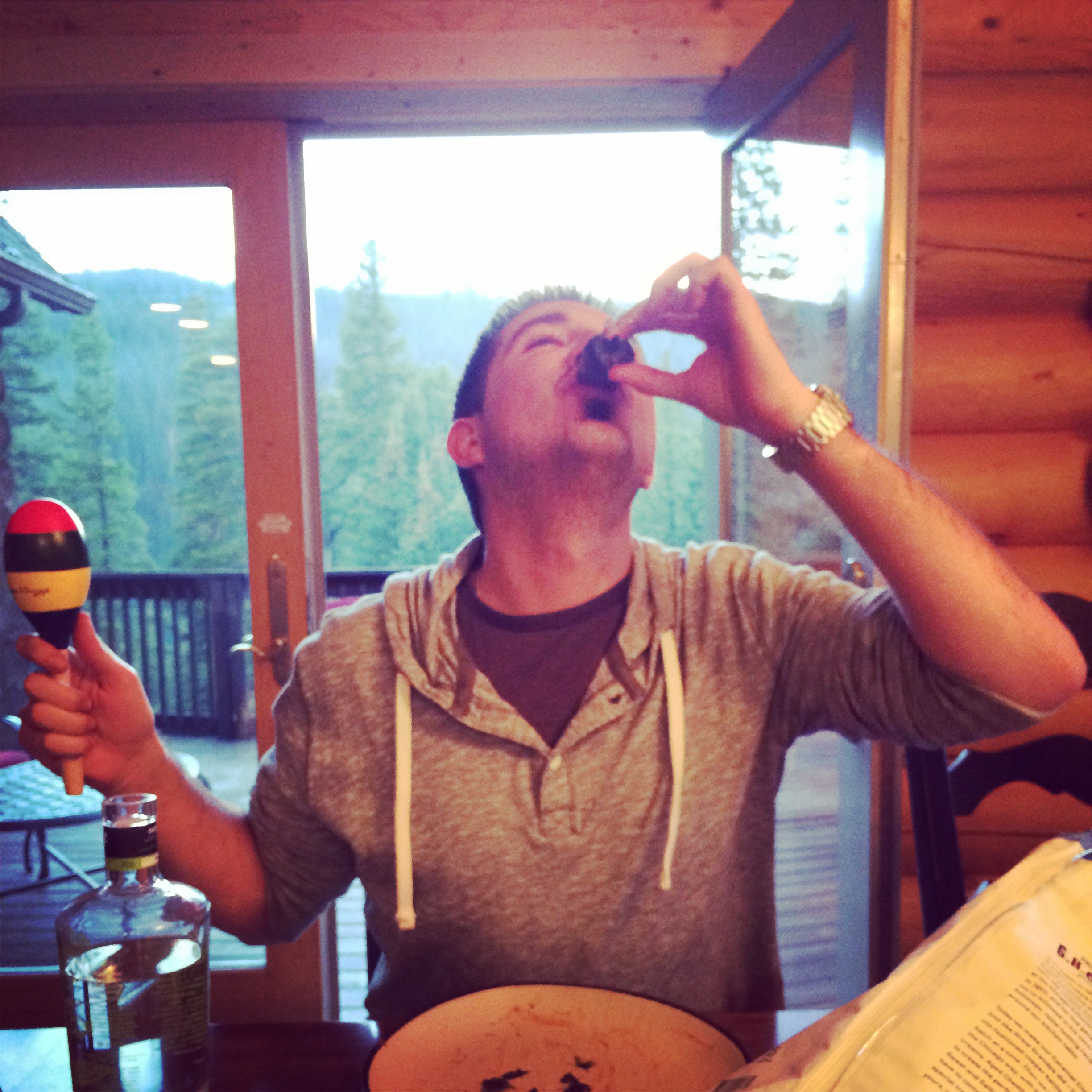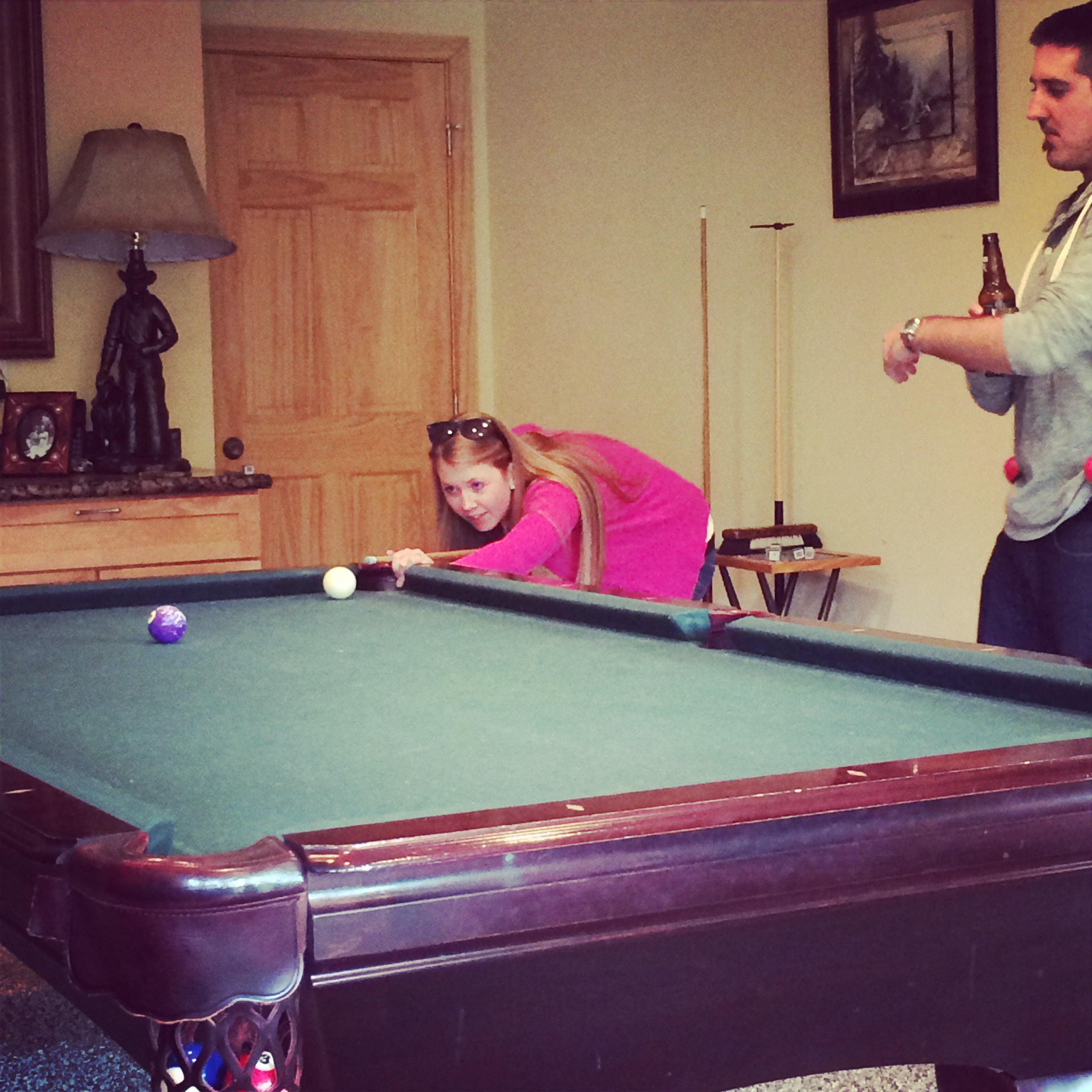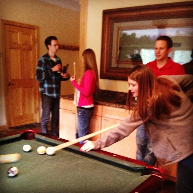 While we were waiting for a few other people to show up to the cabin, we broke into the beer (Snapshot for the win!) and played a few games. I was coerced into playing my first game of pool and I WON! And it only took minor coaching. And by minor, I mean someone had to tell me which ball to go after, where to stand and at what angle I needed to aim. Totally minor. Oh and those maracas? Apparently they were in the cabin and the boys all decided Josh had to carry them around for the weekend and if he dropped one, he’d have to take a shot. They mysteriously disappeared by Saturday…