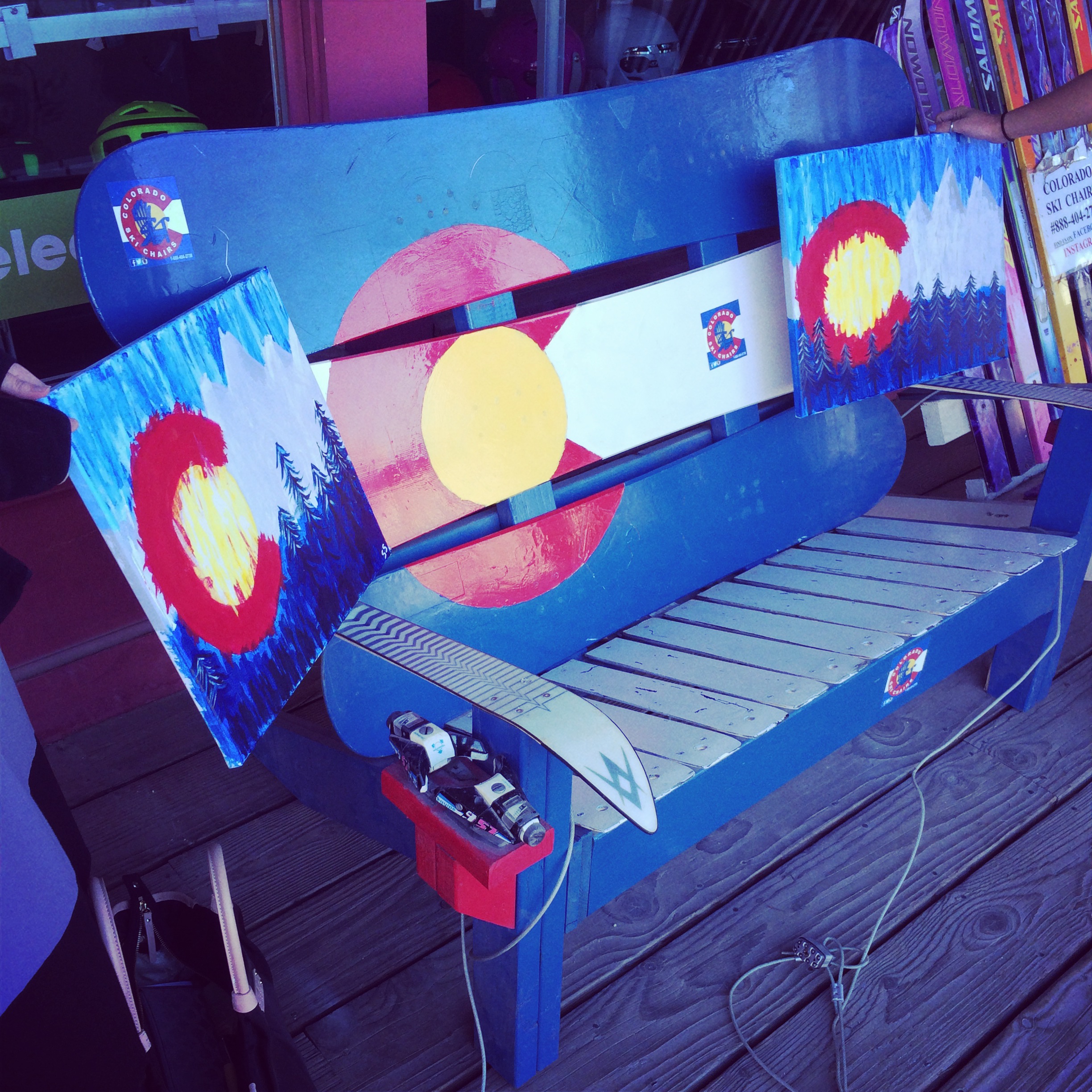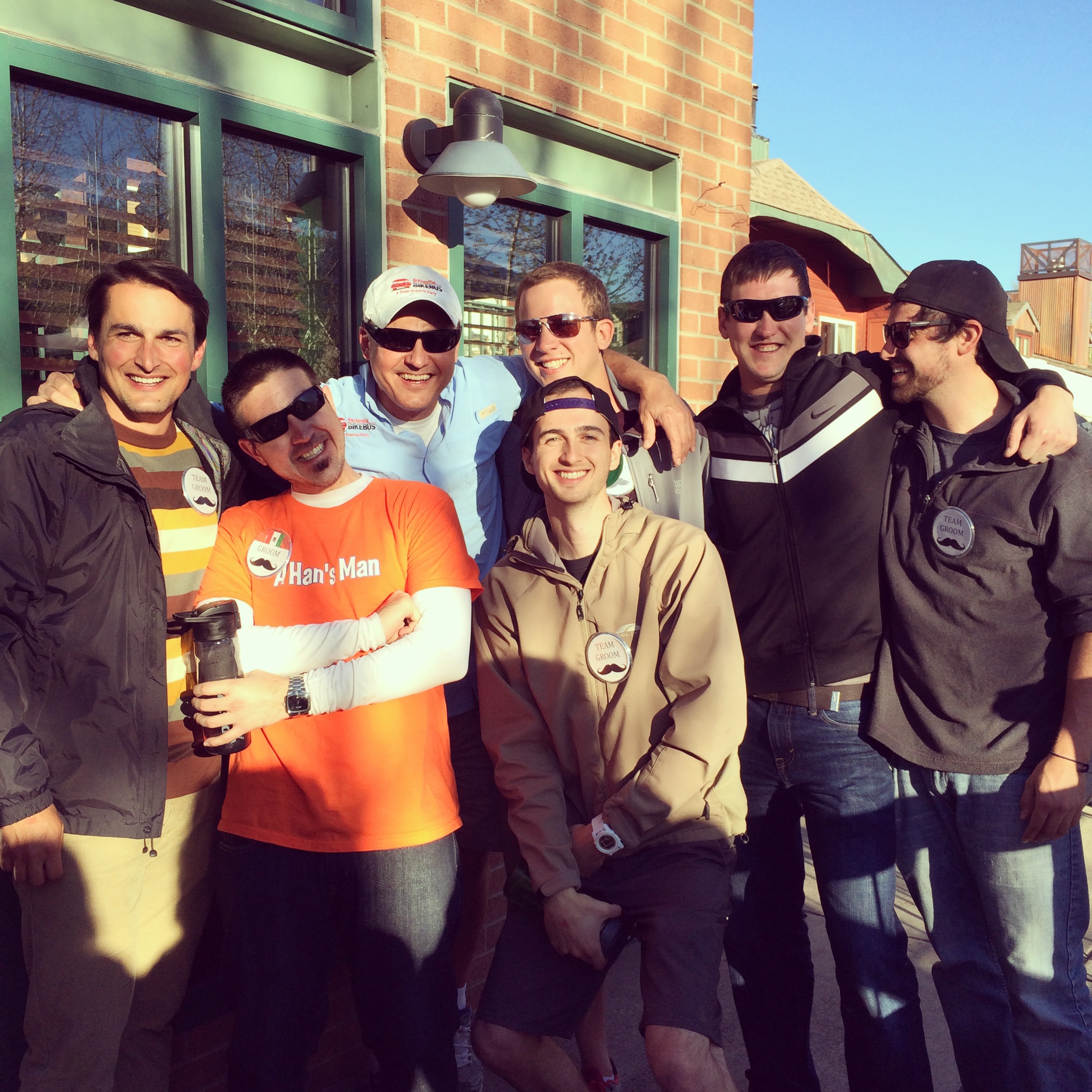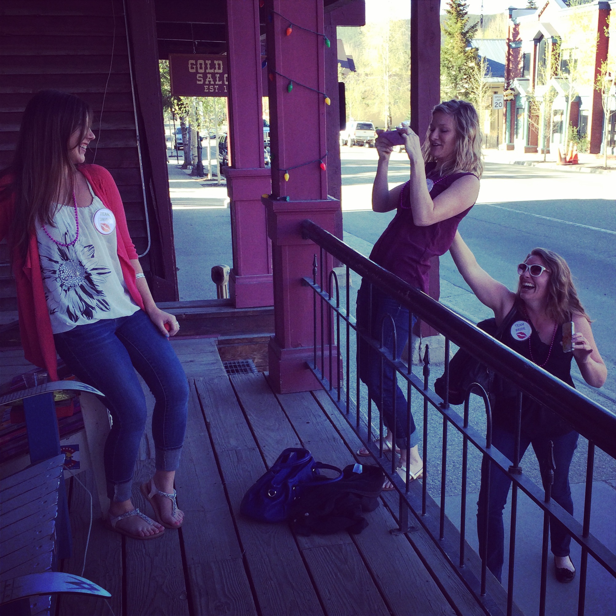 After we were done painting, we walked to meet the boys at their final bar stop, but we may have had some fun taking pictures along the way. How cool are those Colorado benches? And where can I buy one? Oh and please note those fun “Team Bride” buttons Hannah gave us all. I supplied the pink beads 🙂
