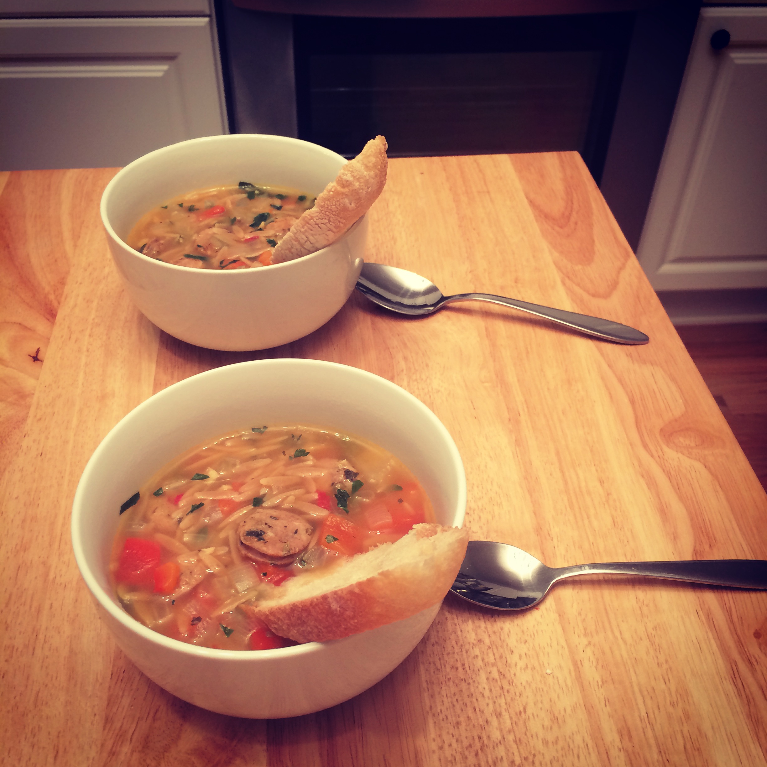 Hearty Chicken Sausage, Roasted Pepper and Whole Wheat Orzo Soup