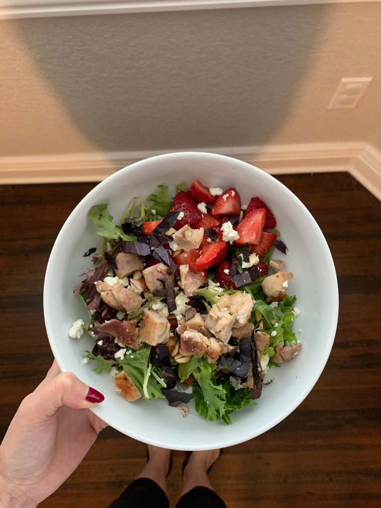 We also put together our stoller — Andi FREAKED out when we were pushing it around the living room but he seemed to enjoy riding it in — and ate a pretty strawberry-basil chicken salad at our table like real adults. Isn’t it pretty?? We are still trying to decide on a chair but we ordered a rug to go underneath so we will wait to see what looks best with that.