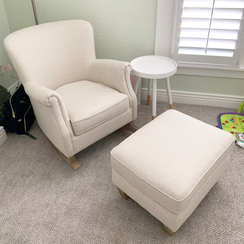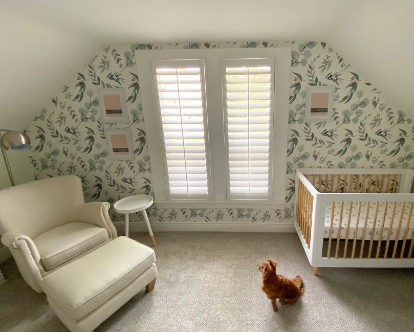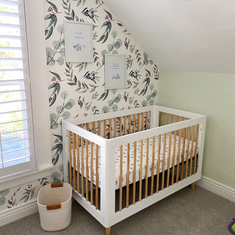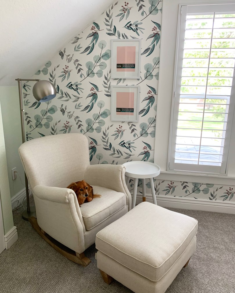 I am so excited to show you our nursery today! I feel like it took soooo long to pick a paint color and then a wallpaper for the accent wall and to get all the furniture, but then a couple of weekends later the whole thing was finished! I am so loving how peaceful and calm it feels (till there’s a crying baby in there, right?? 😋) and even though baby will actually be sleeping in our room for a while, I’m excited to sit in that rocking chair, use that changing table, open that closet full of teensy baby clothes and maybe even use that crib for daytime naps?? Who knows! Here we go!