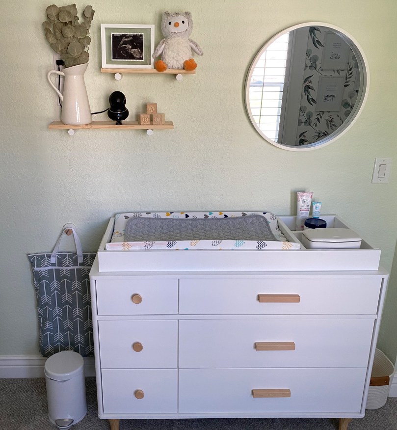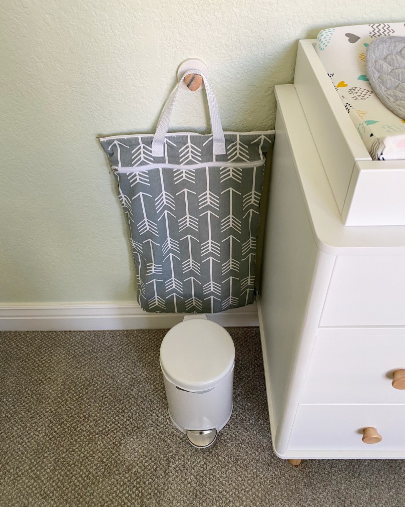 And that’s the whole finished product! Do you love it? I love it! I will link all the items below in case you are curious, but I think the photos are pretty self-explanatory. I will also mention we are waiting on some small hanging bookshelves that are supposed to come some time in October, but those can wait I suppose. We do have a ton of books waiting in the closet though! Joey thought it was weird for me to take a photo of our cloth diaper bag and trash can, but I was sure you guys would want the details of our diaper routine 😂 We didn’t want to commit to any of those expensive trash cans until after we figure out if cloth diapering will work for us. Now all we need in here is a little baby!
