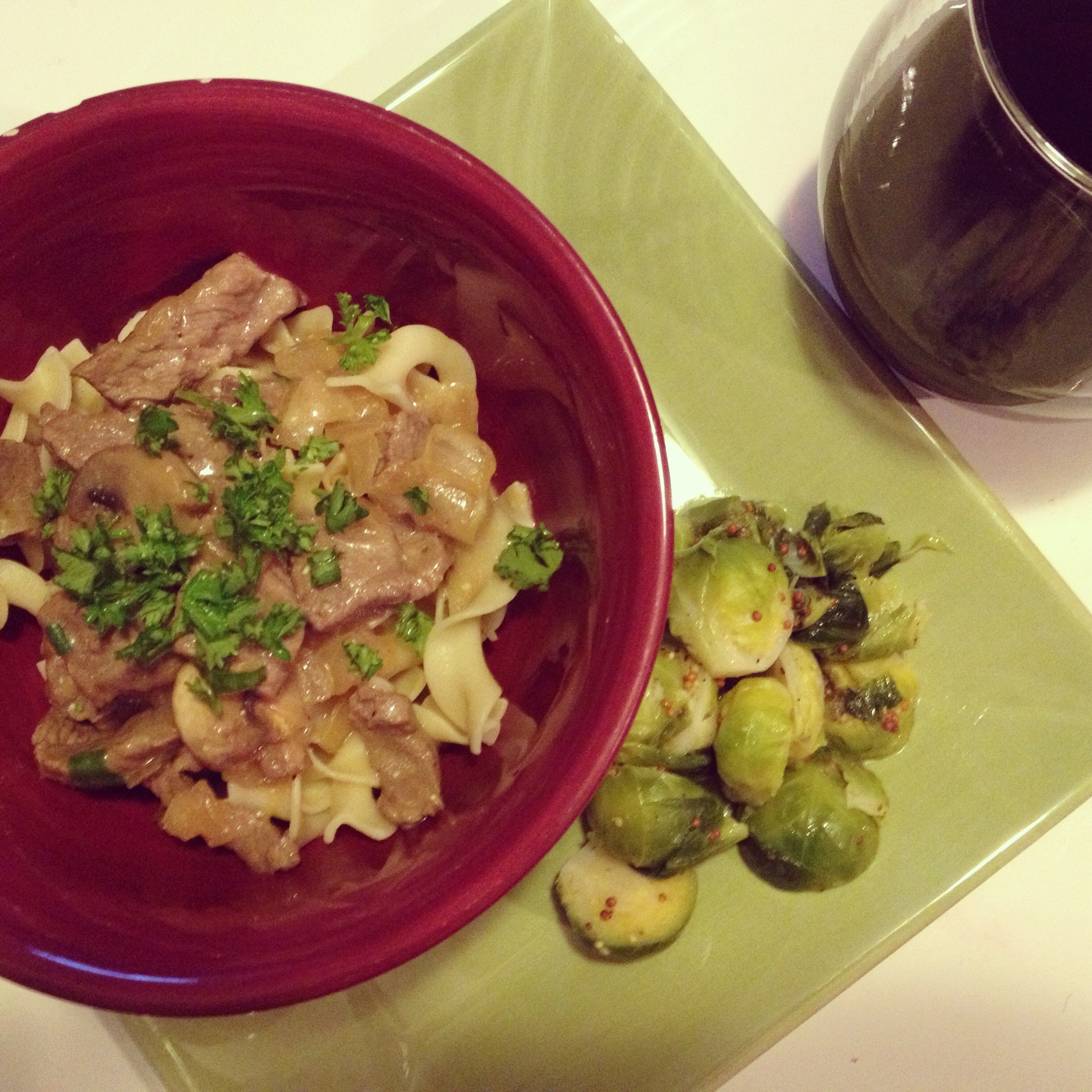 Beef stroganoff, mustardy brussel sprouts and red wine. I’m on a mission to become a wino but I currently know nothing about wine and am paranoid that liquor store employees are suspicious when I wander around the wine section for so long before finally making a decision.